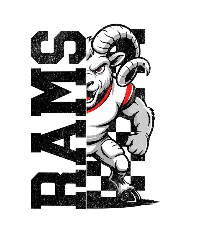 Aggressive Ram Mascot DTF Transfer | Distressed "RAMS" Text Design