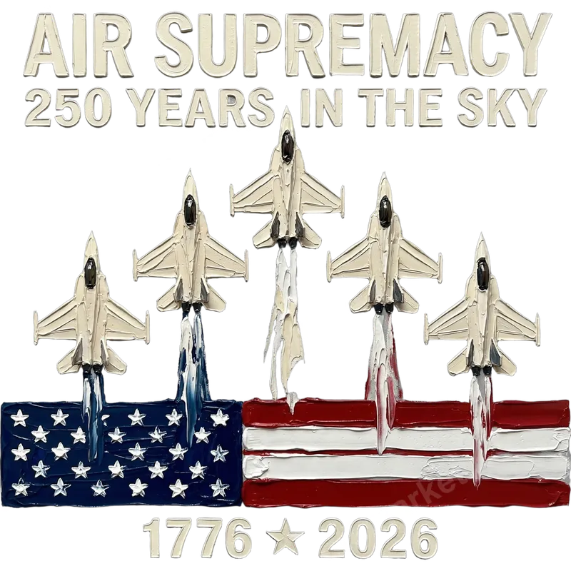 See allDive into the powerful "Air Supremacy" DTF transfer, a striking design commemorating 250 years of American air power. This ready to press transfer showcases five fighter jets ascending dramatically above a textured American flag, capturing a sense of national pride and strength, alongside the dates 1776 and 2026. The artistic, almost painted texture gives this high-quality transfer a unique, distinguished look perfect for any patriotic apparel. Ideal for military personnel, veterans, aviation enthusiasts, and proud Americans, this commemorative heat press design is perfect for celebrating national holidays like the Fourth of July, Memorial Day, or Veterans Day. It makes a thoughtful gift for service members, their families, or anyone passionate about military history and the legacy of American air supremacy. Show your pride and honor with this unique iron on decal. Applying this durable heat press ready design is simple and efficient. It works flawlessly on a wide variety of fabrics, including cotton, polyester, and their blends. Use a heat press at 300-325°F for 15 seconds with medium pressure, or follow instructions for a household iron. Best of all, there's no weeding required, making custom apparel creation quick and hassle-free for your chosen t-shirt transfer. Crafted using premium DTF film, this apparel transfer ensures vibrant colors, exceptional detail, and a soft, smooth finish that resists cracking and peeling. The strong adhesive guarantees a long-lasting, professional result that will stand up to countless washes, allowing you to wear your patriotism with confidence and comfort.