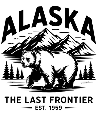 See allThis bold black and white DTF transfer captures the majestic spirit of Alaska with a powerful grizzly bear walking amidst towering snow-capped mountains and evergreen trees. Featuring the iconic 'ALASKA' title above, and 'THE LAST FRONTIER EST. 1959' below, this ready to press design evokes a sense of adventure, wilderness, and state pride. It's a striking graphic that's perfect for anyone who loves the great outdoors or has a special connection to the Alaskan landscape. This design is perfect for travelers, hikers, campers, and anyone with a passion for wildlife and nature. It makes an excellent iron on transfer for creating unique souvenirs from an Alaskan adventure, or as a thoughtful gift for an outdoor enthusiast, dad, or veteran. Small t-shirt businesses and crafters will find this a versatile heat transfer design for producing custom apparel for state parks, tourist shops, or local events. Applying this heat press transfer is a breeze; it works flawlessly on cotton, polyester, cotton-poly blends, and even nylon fabrics. Achieve professional results with a heat press set at 300-325°F for 15 seconds with medium pressure, or use a household iron for smaller projects. No weeding is required – simply peel and press! It's perfect for custom t-shirts, hoodies, sweatshirts, tote bags, pillow covers, baby onesies, aprons, and denim jackets. For lasting durability, always wash your finished garment inside out and tumble dry on low heat. Our ready to press transfer features vibrant, full-color printing with exceptional fine detail, ensuring your finished product stands out. It's crack-resistant and soft to the touch, providing a comfortable feel without the heavy vinyl texture. Each direct to film transfer is printed on premium DTF film with a strong adhesive backing, guaranteeing professional-grade results that will impress every time. Elevate your apparel with a durable and high-quality heat press design.