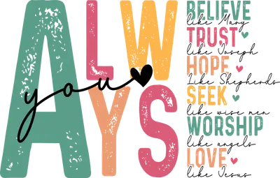 See allThis beautifully designed DTF transfer features the inspiring message 'ALWAYS you' in distressed, rustic block letters, with the 'you' elegantly intertwined in script. Adjacent to this, a powerful list of Christian virtues — BELIEVE like Mary, TRUST like Joseph, HOPE like Shepherds, SEEK like wise men, WORSHIP like angels, and LOVE like Jesus — is presented in a distressed text style with charming heart accents. The soft, muted color palette gives this ready to press design a warm, uplifting, and timeless feel, perfect for expressing devotion. This uplifting Christian heat transfer design is perfect for individuals looking to showcase their faith and spiritual values. Ideal for church groups, youth ministries, bible study participants, and anyone who cherishes the core principles of Christianity. It makes a thoughtful gift for baptisms, confirmations, Easter, Christmas, or simply to encourage a loved one. Etsy sellers and small t-shirt businesses specializing in faith-based apparel will find this iron on transfer a popular choice for creating meaningful merchandise. Applying this vibrant heat press transfer is simple and efficient. It adheres beautifully to a wide range of materials including cotton, polyester, cotton-poly blends, and even nylon. Achieve professional results with a heat press (recommended at 300-325°F for 15 seconds with medium pressure) or a household iron. No tedious weeding is required – just peel and press! Use it to create custom t-shirts, cozy hoodies, inspiring sweatshirts, spiritual tote bags, unique pillow covers, or even thoughtful aprons. For lasting durability, wash garments inside out and tumble dry low. Experience superior quality with this ready to press transfer, featuring vibrant, full-color printing and exceptional fine detail that truly brings the message to life. Our DTF transfers are designed to be crack-resistant and offer a soft, comfortable feel, eliminating the heavy texture often associated with traditional vinyl. Each direct to film transfer is meticulously printed on premium DTF film with a robust adhesive backing, ensuring professional-grade results and long-lasting wear for all your apparel projects.