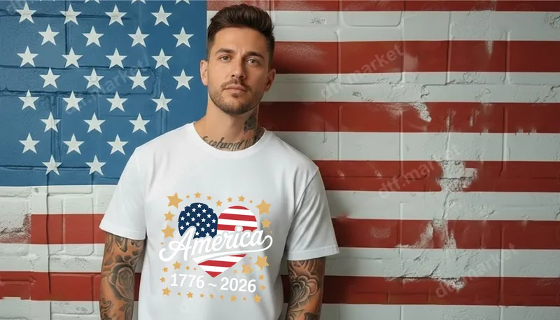 See allShow your patriotic pride with this vibrant 'America 1776-2026' DTF transfer. It features two hearts forming an American flag design – one with stars, the other with red and white stripes – commemorating 250 years of American history. The elegant script for 'America' is surrounded by golden stars, adding a celebratory touch. This ready to press heat transfer captures the spirit of freedom, making it a perfect statement piece for any garment. This versatile heat press design is ideal for anyone who loves their country, from history enthusiasts to proud citizens. Perfect for Fourth of July, Memorial Day, Veterans Day, or everyday patriotic wear. It makes an excellent gift for family, friends, or anyone customizing apparel for national holidays or historical anniversaries. Use this iron on transfer to create custom shirts, tote bags, or hats that truly stand out. Our premium direct to film transfers are easy to apply on cotton, polyester, and blends. For best results, use a heat press at 300-325°F for 15 seconds with medium pressure, then cold peel. A household iron can also be used carefully. Enjoy the convenience of a ready to press transfer with no tedious weeding required, unlike traditional vinyl transfers. Experience superior quality with our durable and vibrant apparel transfers. These high-definition heat transfers boast exceptional color vibrancy, crack resistance, and a soft, lightweight feel that integrates seamlessly. Crafted with professional-grade DTF film and a strong adhesive, your custom transfer will withstand countless washes without fading or peeling. Elevate your wardrobe with a design that's built to last and looks fantastic.