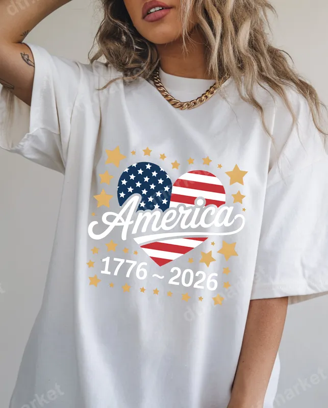See allShow your American pride with this stunning patriotic DTF transfer featuring an iconic American flag heart design. The cursive 'America' text is elegantly layered over the flag, complemented by the significant dates '1776 ~ 2026' and surrounded by a shower of golden stars. This vibrant and professionally printed direct to film transfer is perfect for commemorating national milestones and everyday patriotism, offering a high-quality, ready to press solution for your custom apparel needs. This versatile iron on transfer is ideal for anyone looking to express their love for the USA. It's perfect for Fourth of July celebrations, Memorial Day events, Veterans Day tributes, or as a year-round symbol of national pride. Great for family matching outfits, gifts for patriots, or celebrating the upcoming 250th anniversary of the United States in 2026. Create custom shirts, bags, or accessories that stand out at any gathering or historical observance. Applying this heat press design is simple and efficient. Our transfers are compatible with a wide range of materials, including cotton, polyester, and various fabric blends. For best results, use a heat press at 300-325°F for 15 seconds with medium, even pressure. A household iron can also be used with careful application. Enjoy a professional finish without the hassle of weeding or complex layering – just press and peel! Experience the superior quality of our t-shirt transfers, crafted for exceptional durability and visual appeal. Each transfer boasts vivid, long-lasting colors that resist cracking, peeling, and fading, even after multiple washes. The premium DTF film ensures a soft, lightweight feel on your garment, making it comfortable to wear. Elevate your wardrobe with a design that combines historical significance with modern appeal.