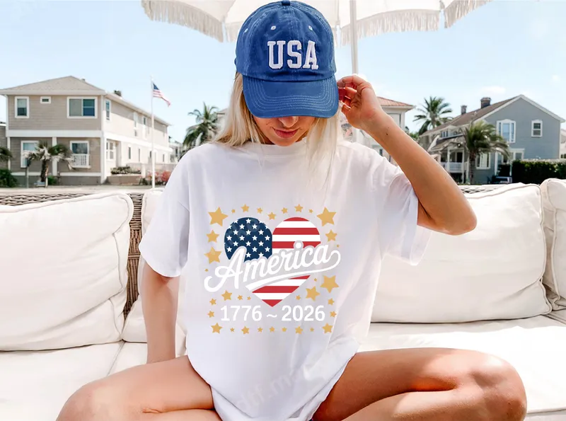 See allThis vibrant DTF transfer celebrates the enduring spirit of America with a striking design featuring an American flag heart. Emblazoned with 'America' in elegant script and the commemorative years '1776 ~ 2026', marking the nation's 250th Semiquincentennial, this ready to press design is framed by golden stars, making it a perfect symbol of national pride. Ideal for American patriots, history enthusiasts, veterans, and families looking to showcase their love for the USA. This heat press transfer is perfect for national holidays like the 4th of July, Memorial Day, or Veterans Day, as well as upcoming Semiquincentennial celebrations in 2026. It also makes a thoughtful gift for those who cherish American history and freedom. Applying this durable iron on transfer is simple. It works beautifully on a wide range of materials, including cotton, polyester, and their blends. For best results, use a heat press at 300-325°F for 15 seconds with medium pressure, followed by a cold peel. No tedious weeding is required, saving you time and effort. You can even apply this apparel transfer with a household iron for smaller projects. Crafted with professional-grade DTF film, this heat transfer design boasts vibrant colors that pop, superior crack resistance, and a soft-to-touch finish. The strong adhesive ensures your design stays put, offering lasting quality that stands up to washes and wear. Create professional-looking garments with ease and pride.