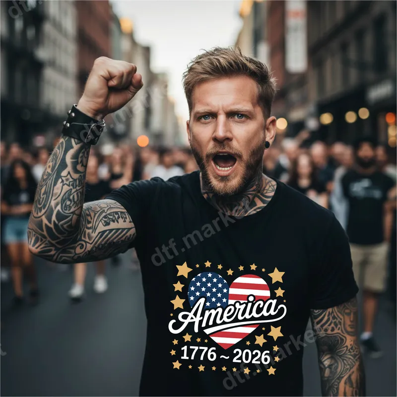 See allCelebrate American heritage and future with this striking America 1776-2026 DTF transfer, featuring a patriotic heart design. This vibrant ready to press transfer showcases the iconic red, white, and blue of the USA flag, with the word "America" elegantly scripted across the heart and surrounded by a shower of sparkling gold stars. The dates 1776 ~ 2026 commemorate a rich history and look forward to a promising future, making it a perfect symbol of enduring national pride. This versatile heat press design is ideal for anyone looking to express their patriotism, from history buffs to proud citizens. It's perfect for celebrating 4th of July, Memorial Day, Veterans Day, or any occasion that calls for a display of national spirit. Craft unique gifts for family and friends, create matching apparel for patriotic events, or simply wear your love for the USA on your sleeve. This iron on transfer makes personalizing garments fun and easy for all ages. Applying this ready to press heat transfer is incredibly straightforward, suitable for cotton, polyester, and most fabric blends. For best results, use a heat press at 300-325°F for 15 seconds with medium, even pressure. Unlike traditional vinyl transfers, there's no tedious weeding required, saving you time and effort. Simply press, peel, and admire your professionally finished apparel. Experience superior quality with our durable direct to film transfers. Each t-shirt transfer is printed with vibrant, fade-resistant inks, ensuring your design remains striking wash after wash. The finished product is incredibly soft to the touch, flexible, and highly crack-resistant, offering a premium feel that will last. Elevate your apparel with a professional-grade iron on decal that truly stands out.