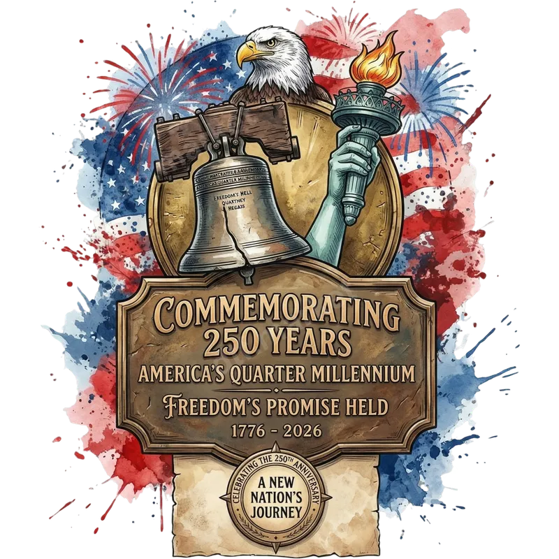 See allShow your American pride with this vibrant 'America's Quarter Millennium' DTF transfer. This striking design commemorates 250 years of American history (1776-2026) with iconic symbols: a majestic bald eagle, the Liberty Bell, and the Statue of Liberty's torch, all set against a dynamic watercolor American flag backdrop with fireworks. This ready to press transfer captures the spirit of freedom and national celebration, making it a powerful statement piece for any garment. This commemorative heat transfer is ideal for patriots, history enthusiasts, and anyone celebrating America's rich heritage. Perfect for the upcoming Semiquincentennial in 2026, Fourth of July, Memorial Day, Veterans Day, or any patriotic event. It makes an exceptional gift for veterans, military families, or history buffs who appreciate a unique shirt design. Elevate your apparel for parades, historical gatherings, or everyday expressions of national pride. Applying this direct to film transfer is straightforward. Our high-quality transfers work beautifully on 100% cotton, 100% polyester, and blends. For best results, use a heat press at 300-325°F for 15 seconds with medium pressure, cold peel. No weeding is required, unlike vinyl transfers; simply press and peel. A household iron can also be used for smaller applications, ensuring a professional look easily. Experience professional-grade results with our premium DTF transfers. Each iron on transfer delivers vibrant colors, crisp details, and superior durability that resists cracking and fading. The soft-touch feel ensures comfort, while the strong adhesive guarantees long-lasting adherence to your fabric. Our transfers are designed for enduring wear, making your custom apparel stand out with a high-quality finish.