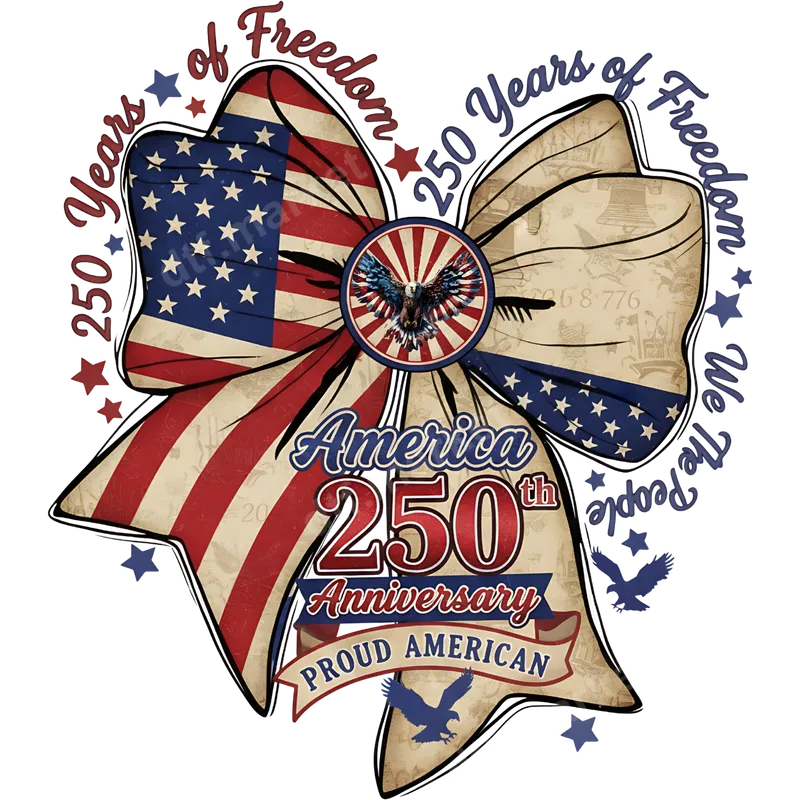 See allThis vibrant DTF transfer proudly celebrates "America's 250th Anniversary" with a magnificent vintage-style bow. Half features the iconic American flag, while the other displays historical parchment details like the Liberty Bell and "1776." A majestic bald eagle at its core is encircled by "250 Years of Freedom" and "We The People." This ready to press design offers a rich, patriotic feel for any garment. Ideal for patriots, history enthusiasts, and anyone expressing American pride, this commemorative design suits Fourth of July, Memorial Day, Veterans Day, or the actual 250th anniversary events in 2026. It's a fantastic gift for military families, veterans, and proud citizens cherishing national heritage. Use this heat press transfer to create custom apparel for family gatherings or community events. Our premium direct to film transfers are versatile and easy to apply on 100% cotton, 100% polyester, and blends. Use a heat press at 300-325°F for 15 seconds with medium pressure. Household iron application is also possible (follow specific instructions). Enjoy no weeding required, saving you time. Experience the exceptional quality of our t-shirt transfers, designed for durability and vibrant results. Each iron on transfer boasts rich, true-to-color hues that resist cracking and peeling, maintaining integrity wash after wash. The professional-grade DTF film ensures a soft touch and strong adhesive bond, delivering a high-quality finish that looks and feels great on any shirt, tote bag, or accessory.