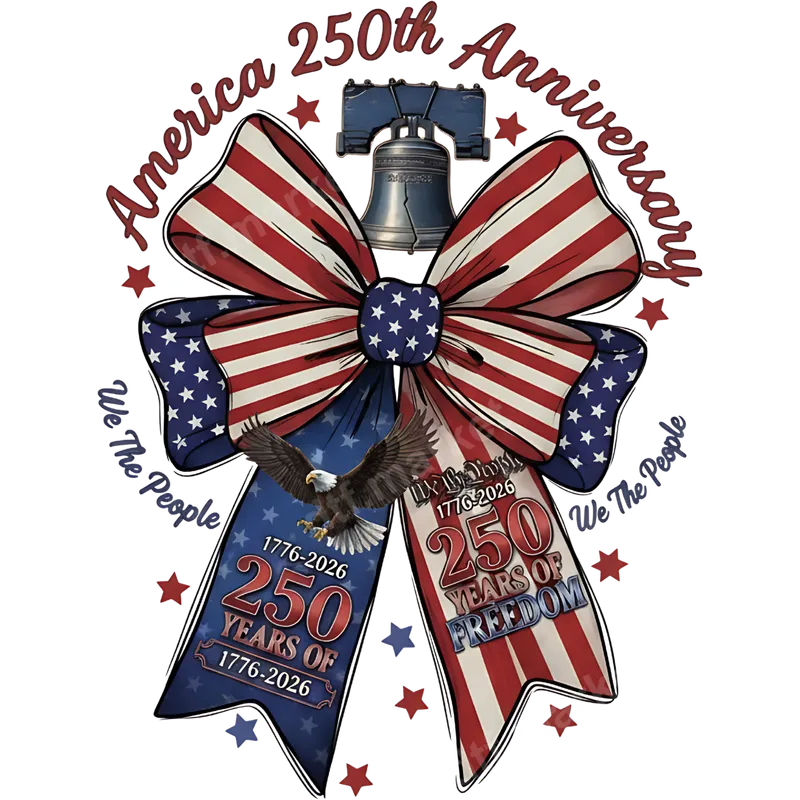 See allThis vibrant DTF transfer commemorates America's 250th Anniversary with a powerful patriotic design. It features a majestic bald eagle soaring before a striking American flag-themed bow, accented by the iconic Liberty Bell and surrounded by patriotic stars. Text proudly declares "America 250th Anniversary" and "250 Years of Freedom" alongside "We The People." This ready to press design encapsulates national pride and historical significance, perfect for celebrating upcoming milestones. This special heat transfer is ideal for anyone looking to celebrate the upcoming Semiquincentennial in 2026, or any patriotic holiday. It’s perfect for veterans, history enthusiasts, civic organizations, and proud Americans who want to display their love for the country. Use it for 4th of July celebrations, Memorial Day, Veterans Day, or as a meaningful gift for family and friends who cherish American heritage. Our direct to film transfers are incredibly versatile, designed for easy application on a wide range of materials including cotton, polyester, and various fabric blends. For best results, apply with a heat press at 300-325°F for 15 seconds with medium pressure, then cold peel. For smaller projects, a household iron can also be used. Unlike vinyl transfer methods, there's no tedious weeding required, making custom apparel creation quick and hassle-free. Experience superior quality with this professional-grade apparel transfer. Our DTF transfers boast vibrant colors, exceptional detail, and a soft-to-touch finish that feels like part of the fabric. Engineered for durability, this iron on transfer is highly crack-resistant and designed to withstand numerous washes without fading or peeling. Each heat press design is printed on premium DTF film with a strong, reliable adhesive, ensuring a long-lasting, professional look on any garment.