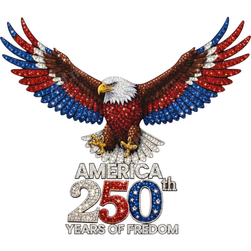 See allShow your patriotic pride with this magnificent 'America 250th Years of Freedom' DTF transfer. This striking design features a majestic bald eagle with wings spread wide, adorned in vibrant red, white, and blue, giving a dazzling rhinestone or jeweled effect. The commemorative text 'AMERICA 250th YEARS OF FREEDOM' gleams, with the '250' sparkling and incorporating flag patterns. This high-quality, ready to press transfer is perfect for making a bold statement of American spirit. This unique heat press transfer is ideal for patriots, veterans, military families, and anyone who loves the USA. It's perfect for commemorating the USA Semiquincentennial in 2026, celebrating the 4th of July, Memorial Day, Veterans Day, or other national holidays. Design custom apparel for parades, patriotic events, family reunions, or as a meaningful gift for friends and loved ones who cherish American history. Showcase your pride and mark this significant milestone. Applying this iron on transfer is straightforward. Our premium DTF transfers work beautifully on a wide variety of fabrics, including cotton, polyester, and cotton-poly blends. For best results, use a heat press at 300-325°F for 15 seconds with medium pressure. It can also be applied with a household iron for convenience. No weeding required, making your customization process quick and hassle-free, delivering a professional finish every time. Experience superior quality with our DTF heat press designs. Each transfer boasts incredibly vibrant colors and sharp details, ensuring your apparel stands out. Designed to be crack-resistant and soft to the touch, this apparel transfer will feel like part of the fabric. Crafted from professional-grade DTF film with strong adhesive, it ensures long-lasting durability and washes well, maintaining its stunning appearance through countless wears and washes. Elevate your garments with this exceptional design.