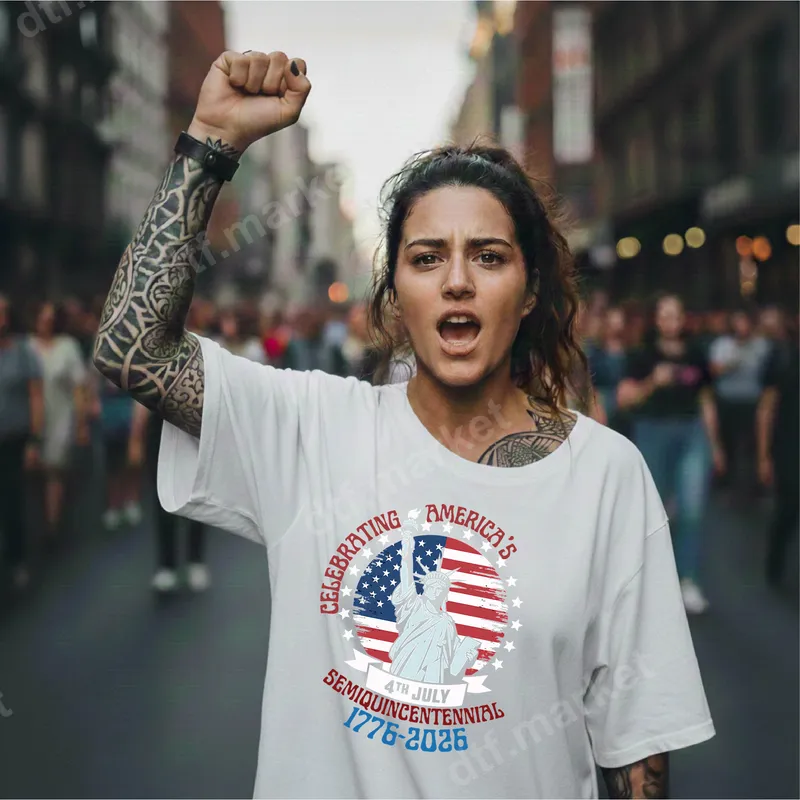 See allThis vibrant DTF transfer proudly commemorates America's Semiquincentennial, celebrating 250 years of independence from 1776 to 2026. Featuring the iconic Statue of Liberty against a distressed American flag background, encircled by the celebratory message 'CELEBRATING AMERICA'S SEMIQUINCENTENNIAL 1776-2026' and a '4TH JULY' banner, this design is a powerful statement of patriotism. This ready to press heat transfer is perfect for creating unique apparel and accessories that honor a significant national milestone. Ideal for proud Americans, history enthusiasts, and anyone celebrating Independence Day or national holidays, this design makes a fantastic gift for veterans, service members, and their families. It's perfect for patriotic events, historical commemorations, or simply showing your national pride year-round. Create custom t-shirts for family gatherings, commemorative hoodies, or unique accessories that highlight this special anniversary. Our high-quality heat press ready design ensures a professional finish on a wide range of fabrics, including cotton, polyester, and their blends. Application is straightforward: simply press with a heat press at 300-325°F for 15 seconds with medium pressure, or use a household iron for smaller projects. There’s no complex weeding required, making this an easy iron on transfer for beginners and experienced crafters alike. Experience stunning colors and sharp details with every press. Our DTF transfers are known for their exceptional vibrancy, crack-resistant durability, and a soft, lightweight feel that blends seamlessly with your garment. Crafted from professional DTF film with a strong adhesive, these apparel transfers are designed to last, ensuring your patriotic statement endures wash after wash.