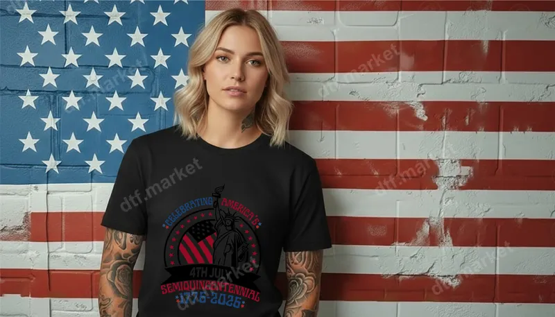 See allThis vibrant DTF transfer proudly commemorates America's Semiquincentennial, celebrating 250 years of independence from 1776 to 2026. The design features "4th July Semiquincentennial *1776-2026*" text, encircling the Statue of Liberty against a stylized American flag. It's a patriotic and commemorative design, perfect for showing national pride. This ready to press transfer brings a festive, historic vibe. This unique heat transfer is ideal for patriots, history enthusiasts, veterans, and anyone celebrating the upcoming 250th anniversary of American independence. It’s perfect for 4th of July festivities, Memorial Day, Veterans Day, national holidays, historical events, or as a meaningful gift for friends and family who cherish American heritage. Show your spirit leading up to 2026 with this distinctive design. Applying this apparel transfer is a breeze. Our high-quality iron on transfer works seamlessly on 100% cotton, polyester, cotton-poly blends, and more. For best results, use a heat press at 300-325°F for 15 seconds with medium pressure. It can also be applied with a household iron, though a heat press is recommended for professional longevity. No weeding or masking required – just press and peel! Experience superior quality with our professional-grade direct to film transfer. These transfers boast incredibly vibrant, crack-resistant colors and are incredibly soft to the touch, ensuring comfort and longevity. Made with premium DTF film and a strong adhesive, your new shirt design will maintain its integrity and look fantastic wash after wash.