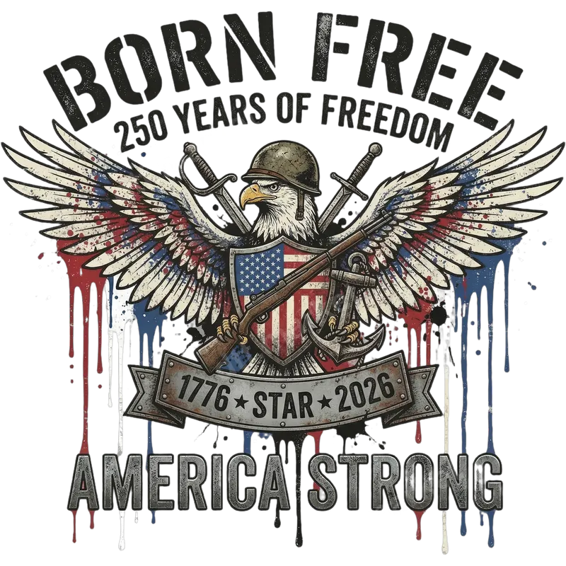 See allThis powerful "Born Free America Strong" DTF transfer showcases a majestic bald eagle, helmet-clad and flanked by crossed swords, a rifle, and an anchor, symbolizing military strength and national pride. Its wings feature a distressed American flag design with vibrant red, white, and blue paint drips, creating a dynamic patriotic look. This high-quality direct to film transfer is ready to press onto your garment, making a bold statement of freedom and resilience. Ideal for national holidays like the 4th of July, Memorial Day, or Veterans Day, this heat press design suits patriots, military families, and veterans. It’s an exceptional gift for anyone wanting to display their USA pride. Commemorating "250 Years of Freedom" from 1776 to 2026, this apparel transfer is a timely piece for celebrating American history. Applying this ready to press transfer is simple and versatile, adhering beautifully to cotton, polyester, and blends. For optimal results, use a heat press at 300-325°F for 15 seconds with medium pressure, then peel cold. Household irons also work well. Unlike traditional vinyl transfers, our DTF transfers require no weeding, making customization quick and easy. Enjoy professional-grade results with our premium DTF transfer. Engineered for exceptional durability, colors remain vibrant and resistant to cracking or fading, ensuring a fantastic look wash after wash. The finished design offers a remarkably soft feel. Crafted with professional-grade DTF film and strong adhesive, this iron on transfer guarantees a long-lasting, high-quality finish every time.