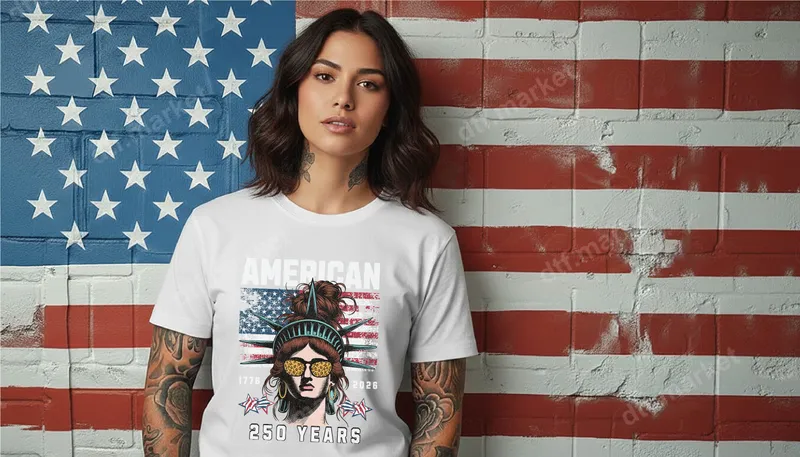 See allThis eye-catching DTF transfer showcases a modern, stylish Lady Liberty sporting a trendy messy bun and leopard-print sunglasses, set against a distressed American flag background. Celebrating "AMERICAN 250 YEARS" from 1776 to 2026, this design is a perfect blend of patriotism and contemporary style. This high-quality ready to press transfer makes it effortless to create custom apparel with a bold statement. Ideal for proud Americans, this heat press transfer is perfect for national holidays like the 4th of July, Memorial Day, and Labor Day, or simply for everyday wear to express your love for the USA. It's a fantastic gift idea for friends, family, or anyone who appreciates unique patriotic designs and American history. Small businesses creating custom apparel will find this t-shirt transfer a popular addition to their inventory. Applying this vibrant design is simple and quick. Our direct to film transfer works beautifully on a wide variety of fabrics, including cotton, polyester, and their blends. For best results, use a heat press at 300-325°F for 15 seconds with medium pressure, then peel cold. A household iron can also be used with careful application. Best of all, there's no tedious weeding required, making customization a breeze. Crafted with professional-grade DTF film, this heat press design ensures brilliant, vibrant colors that resist cracking and fading, even after multiple washes. The strong adhesive provides excellent durability, and the transfer feels soft to the touch on your garment, not thick or heavy. Enjoy a professional, long-lasting finish that truly stands out with this premium iron on decal.