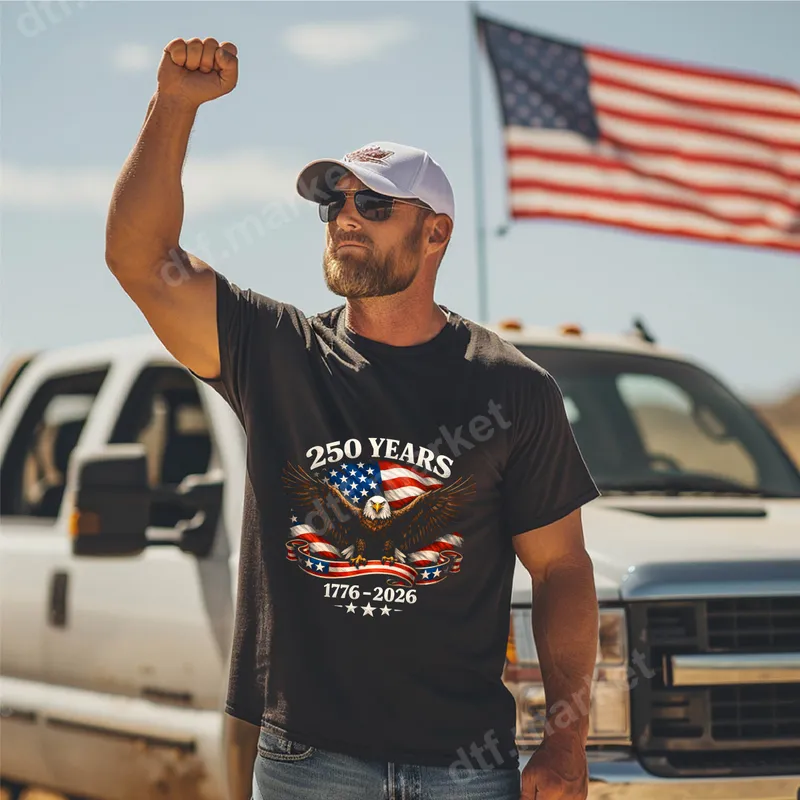 See allShow your unwavering patriotism with this powerful American Bicentennial DTF transfer, commemorating 250 years of liberty from 1776 to 2026. This striking design features a majestic bald eagle with outstretched wings, soaring above a waving American flag, encircled by a proud banner and stars. The bold text "250 YEARS" crowns the design, while "1776-2026" anchors its historical significance. This ready to press design brings a classic, powerful, and deeply patriotic vibe to any garment. This iconic heat transfer is perfect for proud Americans, veterans, active military families, and history enthusiasts. It makes an excellent gift for any patriot and is ideal for celebrating national holidays like the 4th of July, Memorial Day, and Veterans Day. Whether you're attending a parade, a family barbecue, or simply expressing your love for your country, this design allows you to wear your pride on your sleeve – literally. Applying this iron on transfer is simple and efficient, requiring no weeding or intricate steps. Our high-quality transfers are compatible with a wide range of fabrics, including cotton, polyester, and various blends, ensuring versatility for your projects. For best results, use a heat press at 300-325°F for 15 seconds with medium pressure. While a heat press is recommended for professional results, you can also achieve great outcomes with a household iron, carefully following instructions. Experience the superior quality of our professional-grade DTF film, designed for vibrant colors and exceptional durability. This t-shirt transfer ensures a soft-to-touch finish that is crack-resistant and stretches with the fabric, maintaining its integrity wash after wash. The strong adhesive ensures a lasting bond, making your custom apparel truly stand out with a professional, high-definition look.
