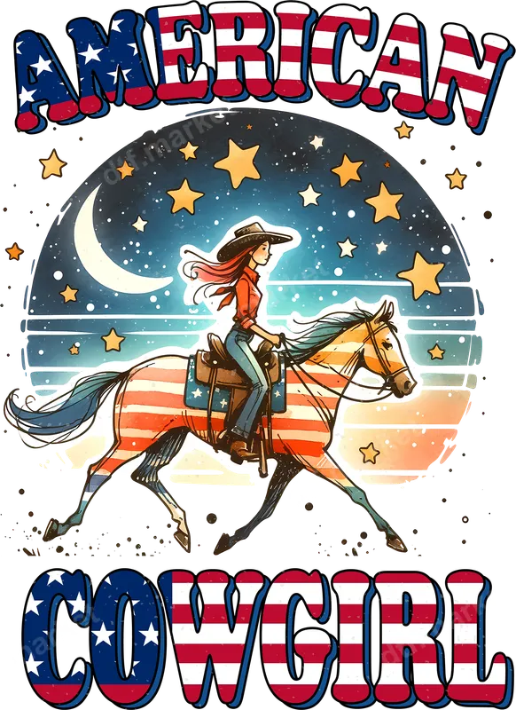See allThis vibrant DTF transfer captures the spirit of the American West with a patriotic twist. It features a stylish cowgirl riding a majestic horse adorned with American flag stripes, set against a dreamy starry night sky. Bold 'AMERICAN' and 'COWGIRL' text, also with stars and stripes, frames this dynamic scene. This eye-catching, ready to press design is perfect for celebrating freedom and Western culture. Designed for the proud cowgirl, horse enthusiast, or anyone embodying American spirit, this heat press transfer is ideal for personalizing apparel. It’s perfect for national holidays like the 4th of July, Memorial Day, or Labor Day. Wear it to rodeos, country music concerts, Western events, or as a unique gift for friends and family who share your passion. Applying this apparel transfer is straightforward. Our high-quality DTF transfers adhere beautifully to cotton, polyester, and various blends. For best results, use a heat press at 300-325°F for 15 seconds with medium pressure, then perform a cold peel. You can also achieve great results with a household iron, following our detailed instructions. There's no tedious weeding required, making your crafting process quick and enjoyable. Experience superior quality with our direct to film transfers. Each design boasts vibrant colors, exceptional durability, and a soft, flexible feel that seamlessly integrates with your garment. Printed on premium DTF film with strong adhesive, our heat press designs are engineered to be crack-resistant and withstand numerous washes, ensuring your personalized items look fantastic for years. Elevate your wardrobe with a professional-grade iron on transfer.