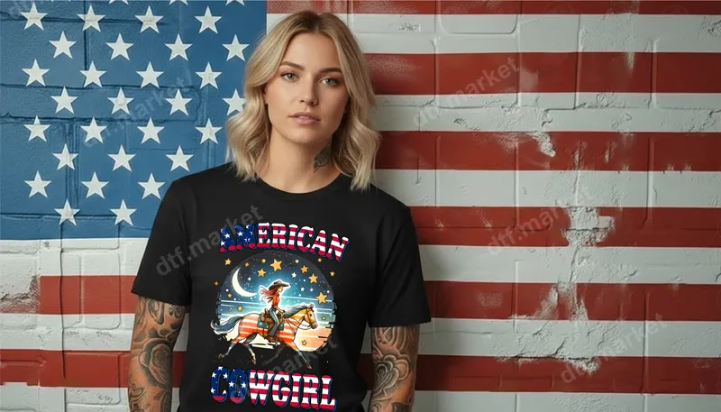 See allThis striking "AMERICAN COWGIRL" DTF transfer showcases a proud cowgirl gracefully riding her horse, both adorned with vibrant American flag stars and stripes. The design captures a spirit of independence and patriotism against a celestial night sky with sparkling stars and a crescent moon. It's a bold and spirited ready to press design perfect for anyone who loves their country and the Western lifestyle. This heat transfer is ideal for patriots, cowgirls, horse lovers, and fans of country music and Western culture. It's a fantastic choice for 4th of July celebrations, Memorial Day, rodeos, country concerts, or everyday wear to express your pride. Gift this unique heat press design to friends and family who embody the American cowgirl spirit, making it a thoughtful present for birthdays or holidays. Applying this iron on transfer is simple and mess-free. Our high-quality direct to film transfer works beautifully on a wide range of materials, including cotton, polyester, and their blends. For best results, use a heat press at 300-325°F for 15 seconds with medium pressure. It can also be applied with a household iron (follow instructions for firm, even pressure). Enjoy the convenience of no weeding or masking required. Experience superior quality with our professional-grade DTF transfer. These t-shirt transfers boast incredibly vibrant colors that pop on any garment, are crack-resistant, and offer a soft, smooth feel once applied. Crafted from durable DTF film with strong adhesive, your new apparel transfer will withstand countless washes, ensuring your American cowgirl design stays looking fresh and fantastic.