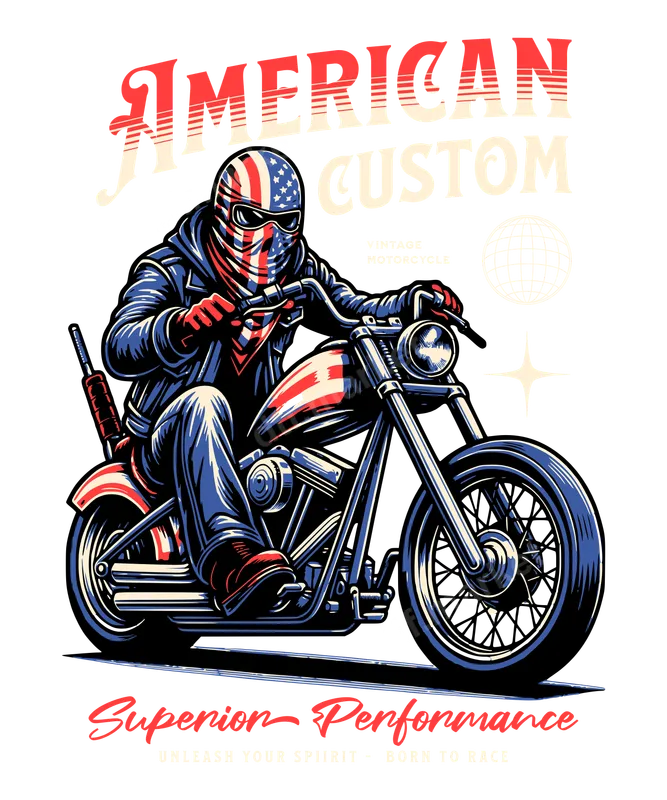 See allRev up your style with this dynamic American Custom Biker DTF transfer, featuring a cool rider donning an American flag bandana on a classic vintage motorcycle. The bold design, emblazoned with "AMERICAN CUSTOM" and "Superior Performance - UNLEASH YOUR SPIIRIT - BORN TO RACE," captures the essence of freedom and the open road. This high-quality DTF transfer is ready to press, allowing you to easily personalize your apparel with a striking, professional finish. This iconic heat press design is perfect for motorcycle enthusiasts, members of biker clubs, and anyone who loves vintage Americana or custom culture. It makes an ideal gift for Father's Day, birthdays, patriotic holidays like Memorial Day or Independence Day, or simply to express a love for the biker lifestyle. Create unique custom apparel for rallies, road trips, or just everyday wear that stands out from the crowd. Applying this iron on transfer is straightforward, making it accessible for both beginners and experienced crafters. It works beautifully on a wide range of fabrics including cotton, polyester, and their blends. For best results, use a heat press at 300-325°F for 15 seconds with medium pressure, then perform a cool peel. A household iron can also be used with care. There's no need for tedious weeding, saving you time and effort. Our professional-grade t-shirt transfers ensure vibrant colors and exceptional durability. The design is crack-resistant, soft to the touch, and made with a strong adhesive that binds perfectly to your garment. Experience superior performance and unleash your spirit with an apparel transfer that truly lasts, reflecting the quality and passion of the open road.