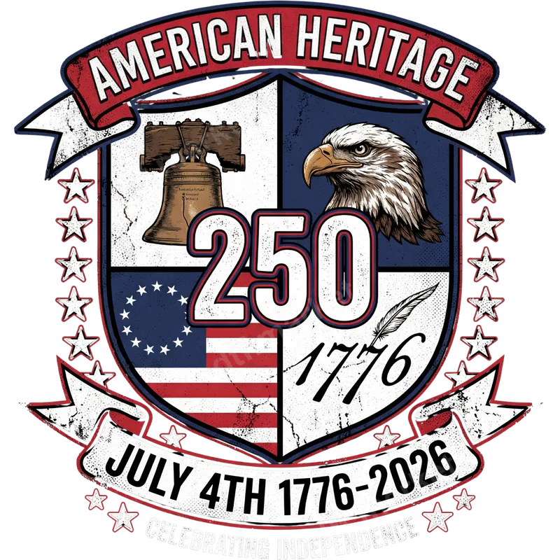 See allThis stunning American Heritage 250th Independence DTF transfer features a detailed, distressed shield emblem, proudly displaying iconic symbols of American freedom. The design includes the Liberty Bell, a majestic bald eagle, the historic Betsy Ross flag, and a quill pen with "1776." Front and center, the bold "250" commemorates the significant milestone of July 4th, 1776-2026, making this a perfect ready to press design for celebrating independence and national pride. Ideal for patriots, history enthusiasts, veterans, and anyone who loves to celebrate American heritage, this heat transfer design is perfect for Independence Day, Memorial Day, patriotic events, or as a meaningful gift. Show your unwavering pride and commemorate this monumental 250th anniversary on your favorite apparel. It's an excellent choice for family gatherings, historical reenactments, or simply everyday wear to express your national spirit. Applying this iron on transfer is simple and efficient. It works beautifully on a wide range of materials, including cotton, polyester, and various fabric blends. For best results, use a heat press at 300-325°F for 15 seconds with medium, even pressure. This direct to film transfer can also be applied with a household iron, offering versatility for crafters and businesses alike. No weeding is required, saving you time and effort. Each heat press design provides exceptional quality with vibrant, long-lasting colors that resist cracking and peeling. Our professional-grade DTF film ensures a soft hand feel on any garment, delivering a premium look and durability that stands up to countless washes. Elevate your apparel with a transfer that truly captures the spirit of American heritage.