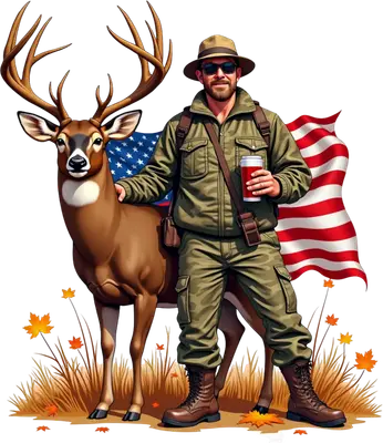 This captivating DTF transfer features a rugged outdoorsman in classic camouflage gear, complete with a hat and sunglasses, holding a drink. Standing proudly beside him is a majestic buck with impressive antlers, evoking the spirit of the hunt. Behind this iconic duo, a waving American flag adds a strong sense of patriotism, while scattered autumn leaves and dry grass grounds the scene in the crisp air of fall. This ready to press design perfectly captures the essence of hunting season, freedom, and the great outdoors. This premium iron on transfer is perfect for avid hunters, patriotic Americans, outdoor enthusiasts, and anyone who appreciates wildlife and the freedom of the wilderness. It makes an excellent gift for Father's Day, birthdays, hunting trip souvenirs, or simply to show off your passion during deer season. Small t-shirt businesses and crafters looking for unique heat transfer designs will find this a popular choice for custom apparel that resonates with a strong, dedicated customer base. Applying this high-quality heat press transfer is simple and efficient. It works beautifully on a wide range of fabrics including cotton, polyester, cotton-poly blends, and even nylon. For best results, use a heat press at 300-325°F for 15 seconds with medium pressure, or follow instructions for a household iron. There's no weeding required—just peel the backing and press! Create stunning custom t-shirts, hoodies, sweatshirts, tote bags, and even hats or denim jackets. For long-lasting wear, wash garments inside out and tumble dry low. Our ready to press transfer ensures vibrant, full-color printing with exceptional detail, bringing every element of this design to life. Enjoy a crack-resistant finish that's soft to the touch, unlike heavy vinyl transfers. Each direct to film transfer is produced on premium DTF film using high-quality inks and a robust adhesive backing, guaranteeing professional-grade results and excellent durability for all your apparel projects.