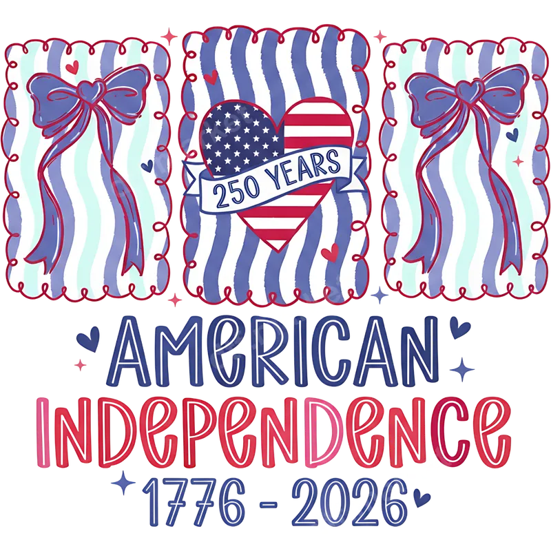 See allThis festive DTF transfer celebrates the 250th anniversary of American Independence. Featuring a stylized American flag heart with a "250 YEARS" banner, framed by whimsical bows and patriotic stripes, it's a vibrant design. The bold, playful lettering declares "AMERICAN INDEPENDENCE 1776 - 2026," making it a perfect ready to press graphic for commemorating this significant milestone. This heat press transfer is ideal for anyone looking to show their American pride in style. Perfect for Fourth of July celebrations, historical events, patriotic gatherings, or as a thoughtful gift for history buffs and proud Americans. Craft unique apparel for family reunions, commemorative events, or simply to wear your patriotism year-round. This design is versatile for personal use or for small businesses creating custom patriotic merchandise. Applying this high-quality iron on transfer is quick and easy, whether you're using a professional heat press or a household iron. It adheres beautifully to a wide range of materials, including cotton, polyester, and various fabric blends. For best results with a heat press, apply at 300-325°F for 15 seconds with medium pressure. This t-shirt transfer requires no weeding, saving you time and effort. Simply press and peel for a flawless finish. Our apparel transfer boasts incredibly vibrant colors and exceptional durability. Made with professional-grade DTF film, it ensures a soft hand feel and excellent stretchability, resisting cracking and peeling even after multiple washes. The strong adhesive guarantees your design stays put, providing a long-lasting, professional look on any garment or accessory.