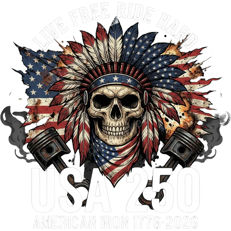 See allThis striking DTF transfer features a powerful blend of American patriotism and biker spirit. A fierce skull wears a Native American-inspired headdress adorned with the stars and stripes, set against a distressed American flag backdrop. Flanked by rugged engine pistons, the design proudly proclaims "LIVE FREE RIDE HARD" and "USA 250 American Iron 1776-2026," making it a truly unique ready to press design for the upcoming anniversary. Perfect for motorcycle enthusiasts, patriotic Americans, and those celebrating the country's 250th anniversary in 2026. This bold shirt design makes an excellent gift for dads, veterans, riders, or anyone who embodies the spirit of American freedom and strength. Create custom apparel for rallies, national holidays like the 4th of July, or simply to showcase your pride and passion. Our premium DTF transfers are incredibly versatile and easy to apply to a wide range of materials. They work seamlessly on cotton, polyester, cotton/poly blends, and even denim. Simply use a heat press at 300-325°F for 15 seconds with medium pressure, then cold peel for a flawless finish. While a heat press is recommended for best results, a household iron can also be used with careful application. No weeding required, making your apparel customization quick and professional. It's a true heat press ready solution for any project. Experience exceptional quality with our direct to film transfer technology. Each iron on transfer delivers incredibly vibrant colors, sharp details, and a soft, smooth feel that won't crack or peel. Manufactured using professional DTF film and strong adhesive, these heat press transfers are built to last, ensuring your custom t-shirt transfer looks great wash after wash.