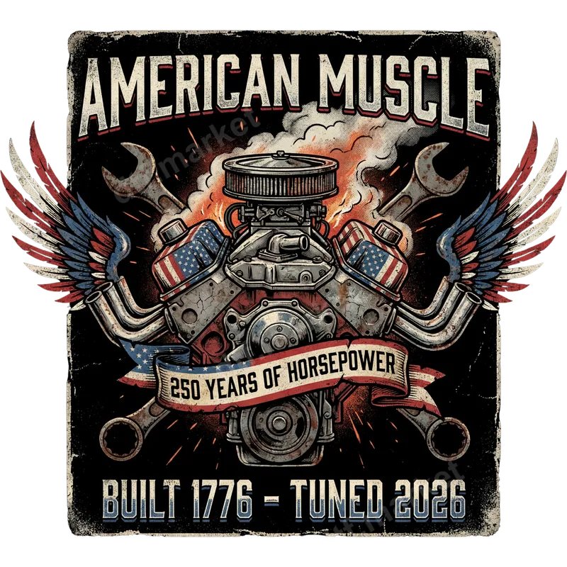 See allThis detailed "AMERICAN MUSCLE" DTF transfer showcases a powerful vintage V8 engine, complete with an air cleaner and exhaust pipes. Adorned with patriotic flag-themed wings and crossed wrenches, the design evokes a sense of enduring American strength. Below the engine, a banner declares "250 YEARS OF HORSEPOWER", framed by "BUILT 1776 - TUNED 2026," celebrating a rich legacy. This ready to press design is perfect for those who appreciate classic power and national pride. Ideal for car enthusiasts, hot rod owners, mechanics, and anyone with a love for American automotive heritage, this design makes a striking statement. It's a fantastic choice for Father's Day, 4th of July celebrations, Memorial Day events, or to wear proudly at car shows and rallies. This unique heat press design also makes an excellent gift for veterans, gearheads, or collectors of vintage Americana. Our premium DTF transfers are incredibly versatile, suitable for application on a wide range of fabrics, including cotton, polyester, and various blends. Applying this heat press transfer is simple: use a heat press at 300-325°F for 15 seconds with medium pressure, or easily apply it with a household iron. Enjoy professional results with no complex weeding required, making custom apparel creation a breeze with this high-quality iron on transfer. Crafted for durability and vibrant appeal, this t-shirt transfer promises exceptional color retention and a soft, flexible feel on your garment. The professional-grade DTF film ensures excellent adhesion and resistance to cracking or peeling, even after multiple washes. Trust in a superior product that brings your custom apparel visions to life with stunning clarity and long-lasting wear.