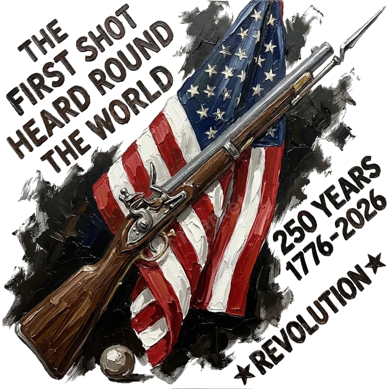 See allThis striking DTF transfer commemorates 250 years of American independence, featuring a historical musket rifle dramatically positioned over a waving American flag. The design captures a powerful, textured, and painterly aesthetic, evoking the spirit of the American Revolution. Bold text proudly declares "THE FIRST SHOT HEARD ROUND THE WORLD" and "250 YEARS 1776-2026 *REVOLUTION*". This ready to press design is perfect for showcasing patriotism and historical appreciation. This patriotic iron on transfer is ideal for history enthusiasts, veterans, military families, and anyone celebrating American heritage. It’s perfect for the 4th of July, Memorial Day, Veterans Day, or historical reenactments. Create meaningful gifts for friends and family who cherish American history, or make unique apparel for patriotic gatherings celebrating the 250th anniversary in 2026. Applying this heat press transfer is simple and efficient. Our high-quality direct to film transfer works beautifully on cotton, polyester, and cotton/poly blends. For best results, use a heat press at 300-325°F for 15 seconds with medium pressure. It can also be applied with a household iron. Best of all, there's no weeding required, saving you time and effort. Experience superior quality with this apparel transfer. Our DTF transfers boast vibrant colors, exceptional durability, and are crack-resistant, ensuring your design looks fantastic wash after wash. The professional-grade DTF film provides a soft, flexible feel on your garment, and its strong adhesive ensures a long-lasting bond for custom shirt transfers.