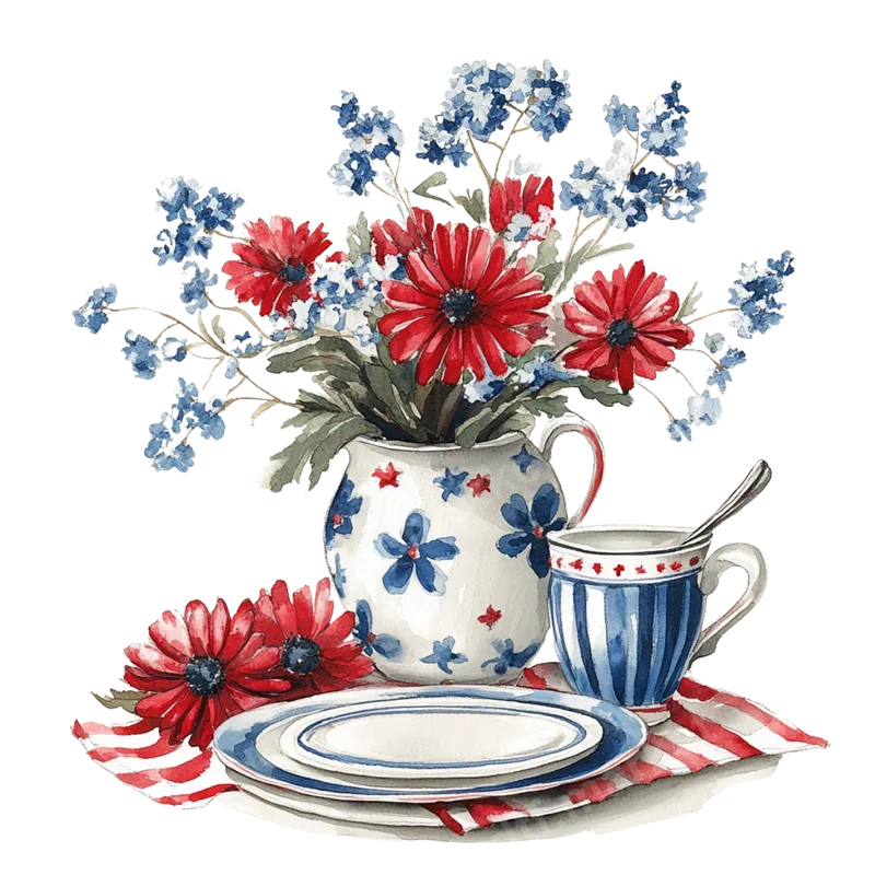 Americana Watercolor Floral DTF Transfer | Patriotic Flowers Table Setting