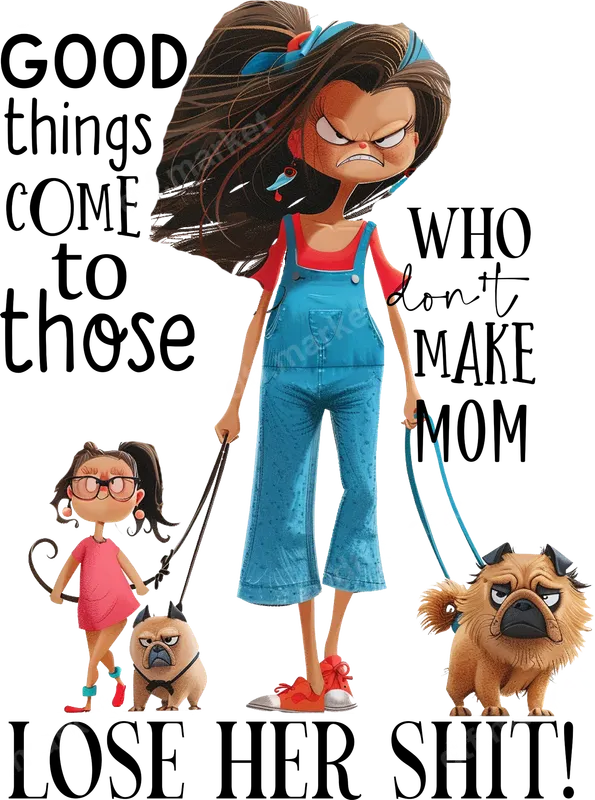 See allThis vibrant DTF transfer captures the relatable chaos of mom life with a sharp, humorous edge. It features a fierce-looking mom in overalls, her child, and two equally grumpy pugs on leashes, all accompanied by the bold declaration: "GOOD things COME to those WHO don't MAKE MOM LOSE HER SHIT!". This ready to press design is a perfect blend of cute illustration and sarcastic wit, making a statement that many parents will instantly understand and appreciate. This design is tailor-made for the amazing, sometimes overwhelmed, moms and parents who navigate daily challenges with a sense of humor. It’s an ideal gift for Mother's Day, birthdays, or just a "thinking of you" present for any mom who deserves a good laugh and a moment of solidarity. Perfect for showing off a sassy attitude, this adult humor apparel transfer lets you wear your truth with pride. Applying this premium heat press transfer is incredibly simple, ensuring a professional finish every time. It adheres beautifully to a wide range of fabrics including cotton, polyester, and their blends. For best results, use a heat press at 300-325°F for 15 seconds with medium pressure, followed by a cold peel. No special skills or frustrating weeding are required, making it a hassle-free iron on transfer for crafting enthusiasts and small business owners alike. Crafted using top-tier DTF film, this transfer promises exceptional durability and a vivid, crack-resistant finish that feels soft to the touch. The professional-grade adhesive ensures your design stays put, maintaining its brilliant colors and sharp details wash after wash. Transform any plain garment into a personalized, conversation-starting piece with this high-quality t-shirt transfer.