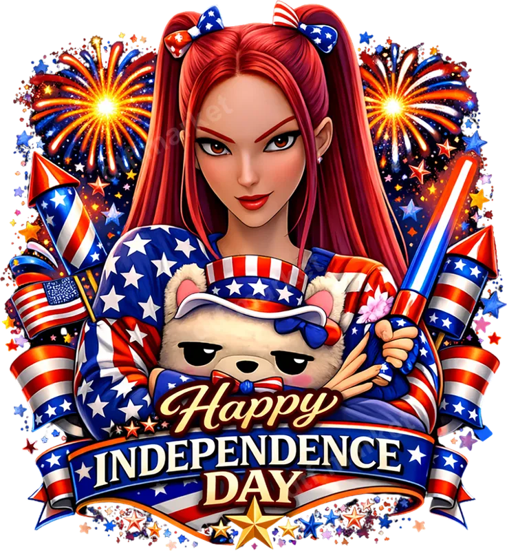 Anime Girl & Bear Happy Independence Day DTF Transfer | Patriotic Fireworks Design