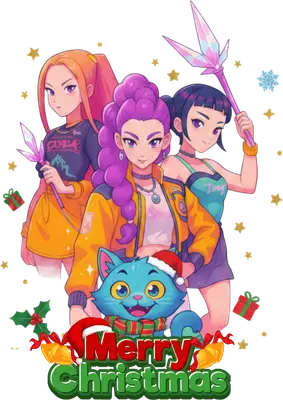 Anime Girls & Blue Cat Merry Christmas DTF Transfer | Vibrant Holiday Apparel