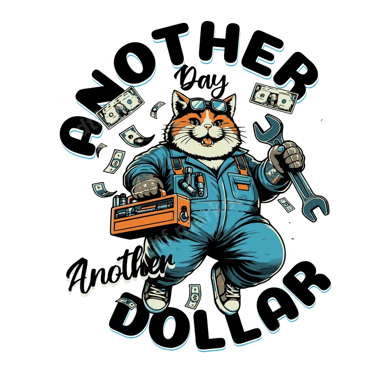 See allShow off your daily grind and love for felines with this vibrant "Another Day Another Dollar" DTF transfer. Featuring a cool, tattooed mechanic cat in overalls, surrounded by flying dollar bills and holding a wrench and toolbox, this design perfectly captures the spirit of hard work and making that money. This high-quality DTF transfer is ready to press, making it easy to create custom apparel instantly. This design is ideal for mechanics, auto technicians, handy individuals, blue-collar workers, and anyone who lives by the "another day, another dollar" mantra. It makes a fantastic gift for Fathers' Day, birthdays, work anniversaries, or just to celebrate the daily hustle. Apply this iron on transfer to t-shirts, sweatshirts, hoodies, and more to add a personalized touch to your wardrobe or business offerings. Applying this heat press transfer is straightforward. Simply use a heat press at 300-325°F for 15 seconds with medium pressure. For best results, a household iron can also be used with firm, even pressure. Our ready to press transfers require no weeding, cutting, or layering, saving you time and effort. Just press and peel for a professional finish. Crafted using premium DTF film and inks, this apparel transfer boasts vibrant colors, excellent wash durability, and a soft-to-touch feel. The transfers are crack-resistant and designed to last, ensuring your custom garments look great wear after wear. Enjoy professional-grade results that stand out.