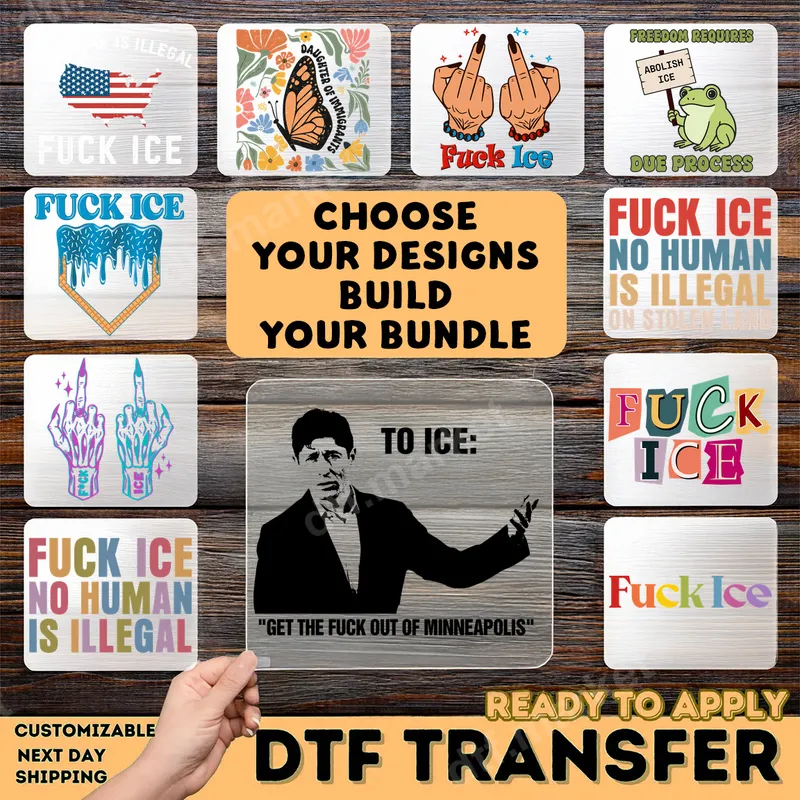 See allThis collection of powerful DTF transfers features a range of bold, anti-ICE designs ready to press onto your chosen apparel. Express strong political dissent with graphics like "F*ck Ice," "No Human Is Illegal," and a frog advocating "Abolish ICE." These provocative heat press designs are perfect for making an undeniable statement, blending activism with unique visual messaging. From subtle references to direct calls for action, each design encapsulates a critical stance on immigration policy. Ideal for activists, protesters, social justice advocates, and anyone passionate about immigration rights. These designs are perfect for rallies, demonstrations, community events, or simply expressing your views through everyday wear. A unique gift for like-minded friends, family, or fellow organizers, these transfers allow individuals to wear their convictions proudly and spark important conversations. Our high-quality DTF (Direct-to-Film) heat transfers are incredibly versatile, adhering seamlessly to cotton, polyester, and various fabric blends. Applying your custom apparel transfer is straightforward: use a heat press at 300-325°F for 15 seconds with medium pressure, or apply with a household iron. Enjoy professional results without the hassle of weeding, making customization quick and easy. Experience vibrant colors, exceptional durability, and a soft-to-the-touch feel with every shirt design. These ready to press transfers are crafted from professional-grade DTF film, ensuring strong adhesion, crack resistance, and long-lasting wear even after multiple washes. Your statement piece will remain impactful, standing up to the demands of everyday use.
