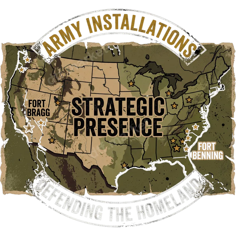 See allEmbrace a powerful display of national service with our "Army Installations Strategic Presence" DTF transfer. This robust design features a distressed, camouflage-patterned map of the United States, prominently highlighting key Army bases like Fort Bragg and Fort Benning with star markers. Bold text declares "ARMY INSTALLATIONS," "STRATEGIC PRESENCE," and "DEFENDING THE HOMELAND," capturing a strong patriotic and military spirit. This premium DTF transfer is an excellent ready to press design for anyone looking to honor our armed forces. This impactful heat press transfer is ideal for active military personnel, veterans, military families, and proud patriotic Americans. It makes a thoughtful gift for enlistment ceremonies, deployments, homecomings, or special holidays like Veteran's Day, Memorial Day, and the 4th of July. Show your unwavering support and pride with apparel that speaks volumes about dedication and national security. Applying this iron on transfer is straightforward, making it perfect for both beginners and experienced crafters. Our high-quality direct to film transfer works seamlessly on a wide variety of fabrics, including cotton, polyester, and their blends. For best results, use a heat press at 300-325°F for 15 seconds with medium pressure, or follow instructions for a household iron. Enjoy a hassle-free application with no weeding required. Crafted for durability and vividness, this apparel transfer boasts vibrant colors and a soft-to-touch finish that resists cracking and fading even after multiple washes. We use professional-grade DTF film with a strong adhesive, ensuring your design remains securely attached and looks great for years to come. Create custom t-shirts, hoodies, and more with this lasting and meaningful heat press ready design.