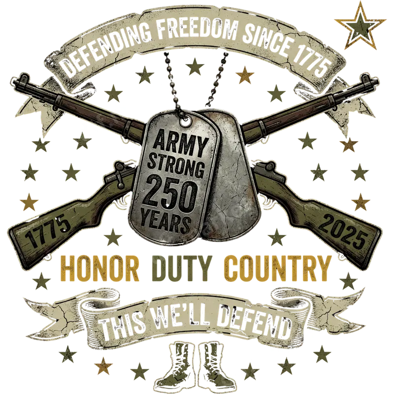 See allThis powerful military DTF transfer commemorates "Army Strong: 250 Years" of service, spanning from 1775 to 2025. The design features an intricate arrangement of crossed vintage rifles, distressed dog tags, and military boots, all elegantly framed by banners that proudly declare "Defending Freedom Since 1775," "Honor Duty Country," and "This We'll Defend." This ready to press design embodies a rustic, vintage aesthetic, making it an exceptional choice for honoring military heritage and American strength. This bold military apparel transfer is ideally suited for active duty soldiers, esteemed veterans, their families, and all patriotic Americans who celebrate freedom and service. It serves as a profound gift for occasions like Memorial Day, Veterans Day, the 4th of July, or any event dedicated to showcasing pride in the U.S. Army. Utilize this impactful heat transfer to create custom t-shirts, sweatshirts, or hats, perfect for reunions, commemorative events, or everyday patriotic display. Our premium heat press design guarantees a flawless application across a diverse range of fabrics, including cotton, polyester, and various blends. Applying this iron on transfer is straightforward with a professional heat press, requiring 300-325°F for 15 seconds at medium pressure. For smaller projects, a household iron can also be used effectively. Experience the unparalleled convenience of a ready to press transfer that eliminates the need for any tedious weeding. Expertly crafted using high-quality DTF film and a strong adhesive, this direct to film transfer delivers remarkably vibrant colors and outstanding durability. The design is engineered to be crack-resistant and peel-resistant, providing a soft, smooth feel on any garment. Achieve professional-grade results that endure countless washes, ensuring your patriotic apparel maintains its sharp appearance for many years.
