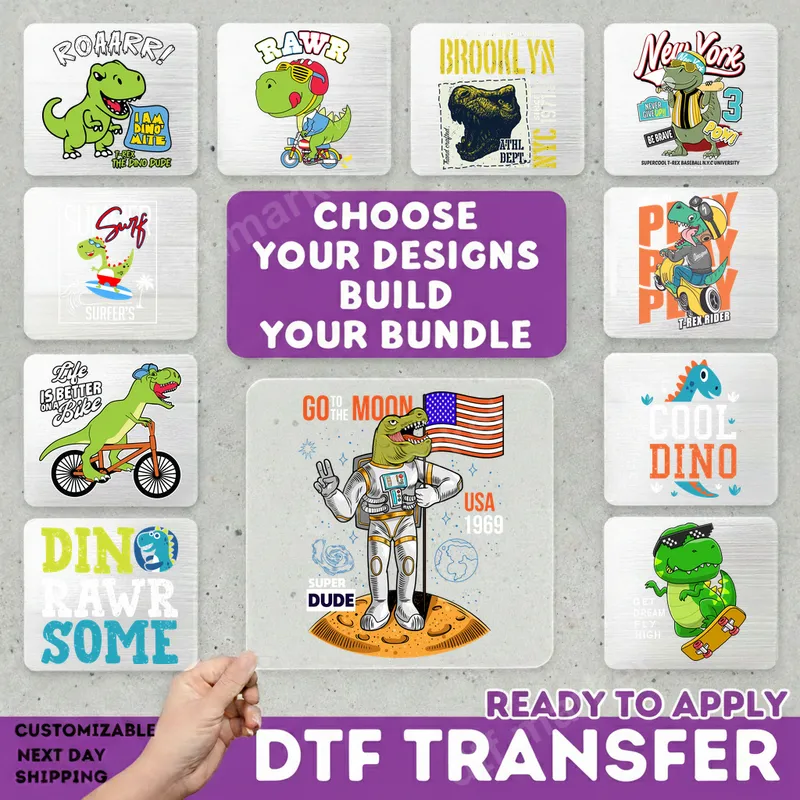 See allThis vibrant DTF transfer showcases a playful T-Rex astronaut planting an American flag on the moon, celebrating the iconic 1969 moon landing. Featuring bold text like "GO TO THE MOON" and "SUPER DUDE," this ready to press design brings a unique blend of prehistoric charm and space adventure to any garment. It's a fun and eye-catching direct to film transfer that's perfect for anyone who loves dinosaurs, space exploration, and a touch of patriotic nostalgia. Ideal for young adventurers, science enthusiasts, or anyone with a love for dinosaurs and space, this versatile heat press transfer makes a fantastic addition to custom apparel. It's a perfect gift for birthdays, back-to-school, or simply to express a child's imagination. Create unique t-shirts, sweatshirts, or tote bags for themed parties, educational events, or everyday wear. Applying this high-quality iron on transfer is a breeze with a heat press or even a household iron. For best results, use a heat press at 300-325°F for 15 seconds with medium pressure. Our DTF transfers are designed for effortless application on various materials, including cotton, polyester, and their blends, making it easy to create professional-looking apparel without any weeding required. Experience the professional quality of our DTF transfers. Each heat press design is crafted using premium film and ink, ensuring vivid colors, exceptional detail, and a soft-to-touch finish that won't crack or peel. Our durable t-shirt transfers maintain their vibrancy wash after wash, providing a long-lasting and impressive addition to any garment or accessory.