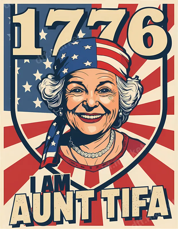 See allThis eye-catching DTF transfer features a smiling, patriotic 'Aunt Tifa' in a vintage propaganda-style design, complete with an American flag bandana and the iconic year '1776.' The artwork boasts a vibrant, retro aesthetic, making a bold and humorous statement. This high-quality direct to film transfer is ready to press, providing a unique way to personalize your apparel and accessories. Perfect for individuals who appreciate witty political humor, American history, and a touch of rebellious spirit. This heat press transfer is ideal for Fourth of July celebrations, election season gatherings, historical events, or simply as a distinctive gift for friends and family with a sharp sense of humor. Show off your unique take on patriotism with this conversation-starting design. Applying this design is simple with a heat press at 300-325°F for 15 seconds with medium pressure, or even a household iron for smaller projects. Our heat press ready transfers work beautifully on a wide range of materials, including cotton, polyester, and various fabric blends. Enjoy a hassle-free application process with no weeding required, just press and peel. Crafted for durability and exceptional visual appeal, this apparel transfer ensures vibrant colors and crisp details that won't crack or fade over time. The professional DTF film offers a soft hand feel and strong adhesive, guaranteeing your iron on decal lasts wash after wash. Transform ordinary garments into extraordinary statements with our premium quality designs.