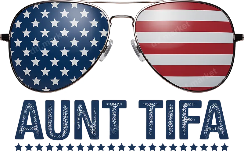 See allThis eye-catching DTF transfer features aviator sunglasses with lenses designed as the American flag: one with stars on a blue field, the other with bold red and white stripes. Below the glasses, the phrase "AUNT TIFA" is rendered in a distressed, patriotic blue font, complete with a row of small stars underneath. This high-quality direct to film transfer is ready to press, offering a unique blend of patriotic imagery and contemporary humor. It's a perfect shirt design for making a statement. Ideal for individuals with a sense of humor who appreciate a witty take on current events and patriotic themes. This design makes a fantastic gift for friends or family members who love political satire, trending memes, or simply enjoy a bold, conversation-starting apparel transfer. Perfect for casual wear, social gatherings, or events where you want to express your unique perspective. It's also a great way to create custom apparel for independence day celebrations. Applying this heat press design is simple and effective across a wide range of fabrics, including cotton, polyester, and various blends. Achieve professional results with a heat press set at 300-325°F for 15 seconds with medium pressure, followed by a cool peel. For home crafters, a household iron can also be used with careful technique. Enjoy the convenience of a ready to press transfer that requires absolutely no weeding, saving you time and effort. Our professional-grade DTF transfers deliver exceptional vibrancy and durability. The colors are incredibly vivid, ensuring your finished garment stands out, and the print is designed to be crack-resistant, maintaining its integrity wash after wash. The soft-touch finish ensures comfort when worn, making it feel like part of the fabric. Each heat transfer is produced using high-quality DTF film and strong adhesive, guaranteeing a long-lasting, professional finish on any garment.