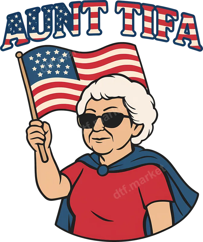 See allThis unique "Aunt Tifa" DTF transfer features a spirited, flag-waving grandma, complete with a patriotic cape and cool sunglasses. The retro-inspired artwork combines classic American flag motifs within the "AUNT TIFA" lettering, creating a humorous and bold statement. This ready to press design is perfect for those who appreciate witty political humor mixed with a touch of vintage charm, ready to apply to your favorite garment. Ideal for anyone with a playful sense of humor, this heat press design is perfect for grandmas, aunts, or any patriotic individual looking to make a lighthearted statement. It's a fantastic choice for Fourth of July celebrations, family barbecues, political events, or as a fun, unexpected gift. Show off your unique style and spark conversations with this memorable apparel transfer. Applying this high-quality iron on transfer is simple and efficient. It works seamlessly on a wide range of fabrics, including cotton, polyester, and their blends. Achieve professional results using a heat press set at 300-325°F for 15 seconds with medium pressure, or apply it easily with a household iron. Best of all, there's no weeding required, saving you time and effort. Crafted with professional-grade DTF film, this heat press ready design promises exceptional durability and a vibrant, crisp finish. The colors are engineered to resist cracking, peeling, and fading, ensuring your design looks fresh wash after wash. Enjoy a soft, smooth feel on your garment, making this a comfortable and long-lasting addition to your wardrobe.