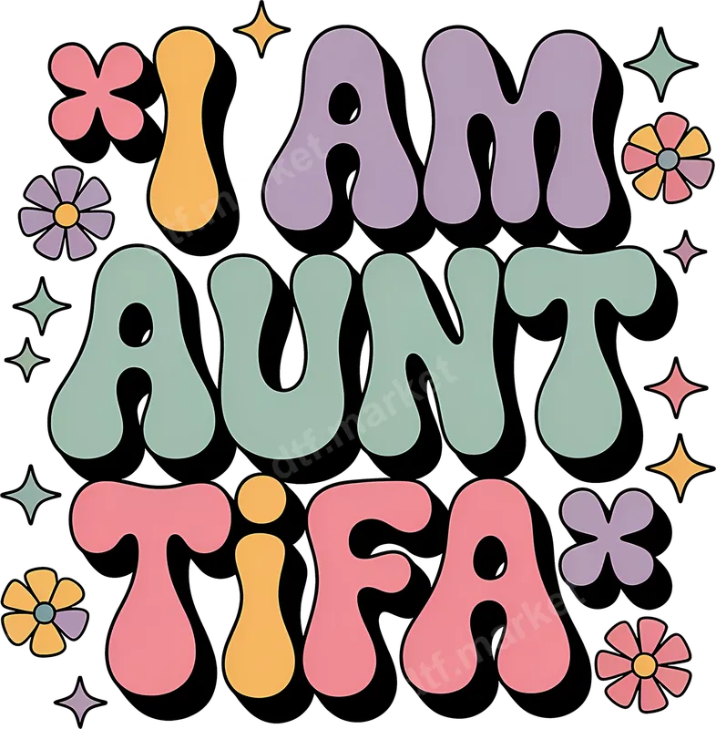 See allDive into retro vibes with our 'I AM AUNT TiFA' DTF transfer, featuring bold, groovy lettering in charming pastel shades of lavender, mint, peach, and pink. Adorned with whimsical flowers and sparkling stars, this eye-catching design offers a playful yet subtly defiant aesthetic. It's a perfect ready to press graphic combining vintage style with a modern, sarcastic twist. This unique heat press transfer is ideal for the cool, sarcastic aunt or anyone who loves to make a witty statement. Perfect for birthday gifts, casual wear, family gatherings, or an ironic touch for social events, it lets you express personality with humor. Show off your fun, edgy side with this standout iron on transfer. Our versatile direct to film transfer applies effortlessly to cotton, polyester, and blends. For best results, use a heat press at 300-325°F for 15 seconds with medium pressure, followed by a cool peel. It can also be applied with a household iron, making customization accessible. Enjoy a hassle-free application with no weeding required. Experience professional-grade quality with our vibrant and durable DTF transfers. Each shirt design uses premium film, ensuring rich, crack-resistant colors and a soft-to-touch finish. The strong adhesive guarantees your design lasts wash after wash, maintaining its vivid appearance. Create custom apparel reflecting your unique style and attitude.