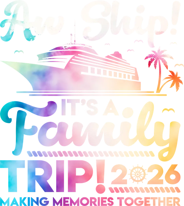 See allGet ready to set sail with our vibrant 'Aw Ship! It's a Family Trip! 2026 Making Memories Together' DTF transfer. This fun, watercolor-inspired design features a majestic cruise ship, swaying palm trees, and playful text, all infused with a lively gradient of blues, purples, pinks, and oranges. It's the perfect ready to press DTF transfer to commemorate your unforgettable 2026 family cruise or group vacation. This delightful design is ideal for families planning a big adventure, cruise enthusiasts, and anyone looking to create matching apparel for their trip. Imagine everyone sporting these fun heat transfer designs on their shirts, making memories even before you embark! It's also a fantastic gift idea for travel planners, grandparents, or anyone organizing a memorable family reunion or group outing. Applying this apparel transfer is a breeze. Our DTF transfers work seamlessly on a wide range of materials, including cotton, polyester, and various blends. Simply use a heat press at 300-325°F for 15 seconds with medium pressure, or even a household iron for smaller applications. The best part? There's no weeding required, saving you time and effort so you can focus on enjoying your trip prep. Crafted with professional-grade DTF film and strong adhesive, this iron on transfer guarantees exceptional quality. The colors are incredibly vibrant and will remain crack-resistant and soft to the touch, even after multiple washes. Ensure your family stands out and captures those precious moments with a durable, high-quality t-shirt transfer that truly lasts.
