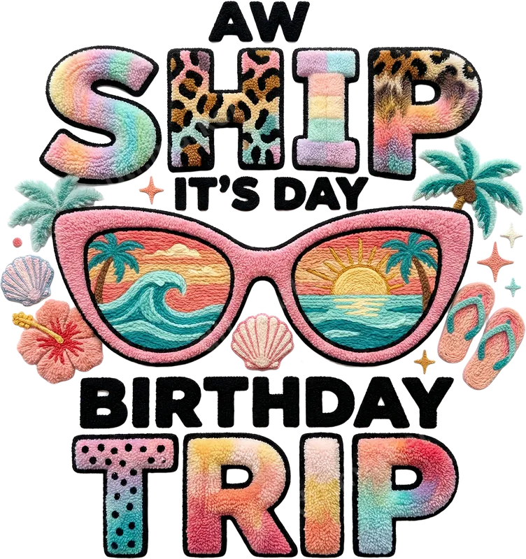 See allGet ready for an unforgettable birthday getaway with this vibrant 'AW SHIP IT'S DAY BIRTHDAY TRIP' DTF transfer. This playful design captures tropical vacation excitement, featuring a unique chenille-patch effect on lettering with pastel rainbow gradients, leopard print, and polka dots. Pink cat-eye sunglasses reflect a serene beach scene with palm trees, waves, and a sunset, accented by hibiscus, seashells, and flip-flops. It's a fantastic heat press ready design for celebrating in style. This sassy and fun apparel transfer is ideal for anyone celebrating their birthday with a trip to the beach, a cruise, or a summer adventure. Perfect for birthday girls, groups of friends on a celebratory journey, or family members creating matching outfits for a special vacation. It also makes an excellent gift for a friend who loves travel and sunshine. Applying this ready to press transfer is incredibly easy, making custom apparel accessible. Our high-quality direct to film transfer works beautifully on cotton, polyester, and most blends. Simply use a heat press at 300-325°F for 15 seconds with medium pressure, or a household iron with specific instructions. There's no weeding required, saving you time and effort for your custom t-shirt transfer. Experience professional-grade results with our premium DTF transfer. Crafted with superior vibrancy, colors pop and maintain intensity wash after wash. The design is crack-resistant and boasts a soft-to-the-touch feel, ensuring comfort and durability. This isn't just an iron on; it's a high-quality product printed on professional DTF film with a strong adhesive, guaranteeing a long-lasting, impressive finish.
