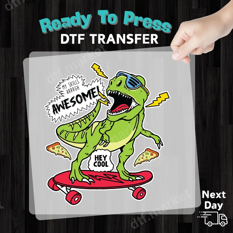 See allDive into fun with this awesome Skater T-Rex DTF transfer! This vibrant heat press design features a cool green dinosaur sporting blue sunglasses and shredding on a red skateboard, surrounded by electric lightning bolts and delicious pizza slices. With energetic speech bubbles like "AWESOME!" and "HEY COOL," this direct to film transfer captures a playful, retro vibe that's ready to bring a roar to any garment. It's a high-quality, ready to press transfer perfect for adding instant personality. This epic iron on transfer is ideal for kids, teens, and anyone who loves dinosaurs, skateboarding culture, or a touch of retro flair. Perfect for birthday gifts, casual everyday wear, or school events, it's a fantastic t-shirt transfer that adds a unique touch to any wardrobe. Imagine it on a cool hoodie for your son, a fun tee for a nephew, or a standout design for friends who appreciate a blend of prehistoric power and modern cool. Applying this ready to press transfer is a breeze! It works seamlessly on a wide range of fabrics, including cotton, polyester, and their blends. For best results, use a heat press at 300-325°F for 15 seconds with medium pressure, followed by a warm peel. If a heat press isn't available, a household iron can also be used. The best part? There's absolutely no weeding required, making custom apparel creation quick and hassle-free. Experience superior quality with this professional-grade DTF transfer. Crafted from durable film with a strong adhesive, our heat press ready designs boast incredibly vibrant colors that pop and a soft, smooth feel that integrates beautifully into the fabric. These apparel transfers are designed to be crack-resistant and long-lasting, ensuring your Skater T-Rex stays awesome wash after wash.