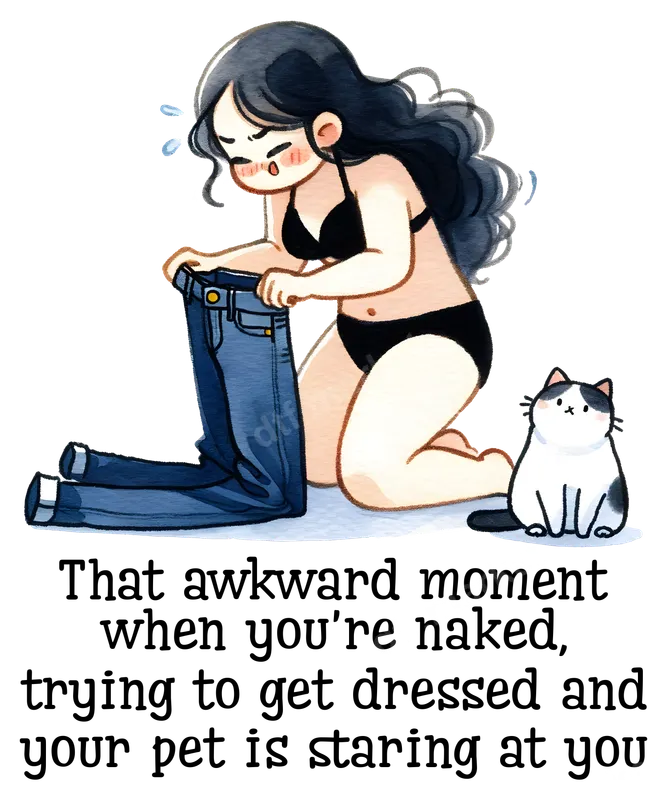 See allCapture the universally relatable and hilarious moment of a pet's unblinking stare with our "Awkward Pet Stare" DTF transfer. This design features a cartoon woman in her underwear, humorously struggling to pull on her jeans while her unimpressed cat observes her every move. The accompanying text, "That awkward moment when you're naked, trying to get dressed and your pet is staring at you," perfectly encapsulates the witty, everyday pet-owner experience. This ready to press transfer is a must-have for anyone who's lived this exact scenario. This humorous heat transfer is designed for cat parents, animal lovers, and anyone who appreciates a good, relatable meme. It makes a fantastic conversation starter or a unique gift for birthdays, holidays, or just because. Surprise a friend, family member, or yourself with this charming iron on transfer that speaks volumes about the joys and oddities of pet ownership. It’s ideal for casual wear, showcasing your fun personality, or adding a touch of humor to your crafting projects. Applying this direct to film transfer is incredibly easy, making it perfect for both beginners and experienced crafters. It adheres beautifully to a wide range of fabric types, including cotton, polyester, and various blends. For best results, use a heat press at 300-325°F for 15 seconds with medium pressure, then cold peel the film. No weeding, no layering, just a simple press and you’re done! You can even achieve great results with a household iron following careful instructions. Our professional-grade DTF transfers ensure vibrant colors and exceptional durability. The design is crack-resistant, peel-resistant, and maintains a soft, flexible feel on the garment. This high-quality apparel transfer means your custom creation will look fantastic and last through countless washes, becoming a long-loved piece in any wardrobe. Enjoy creating personalized items with ease and confidence.