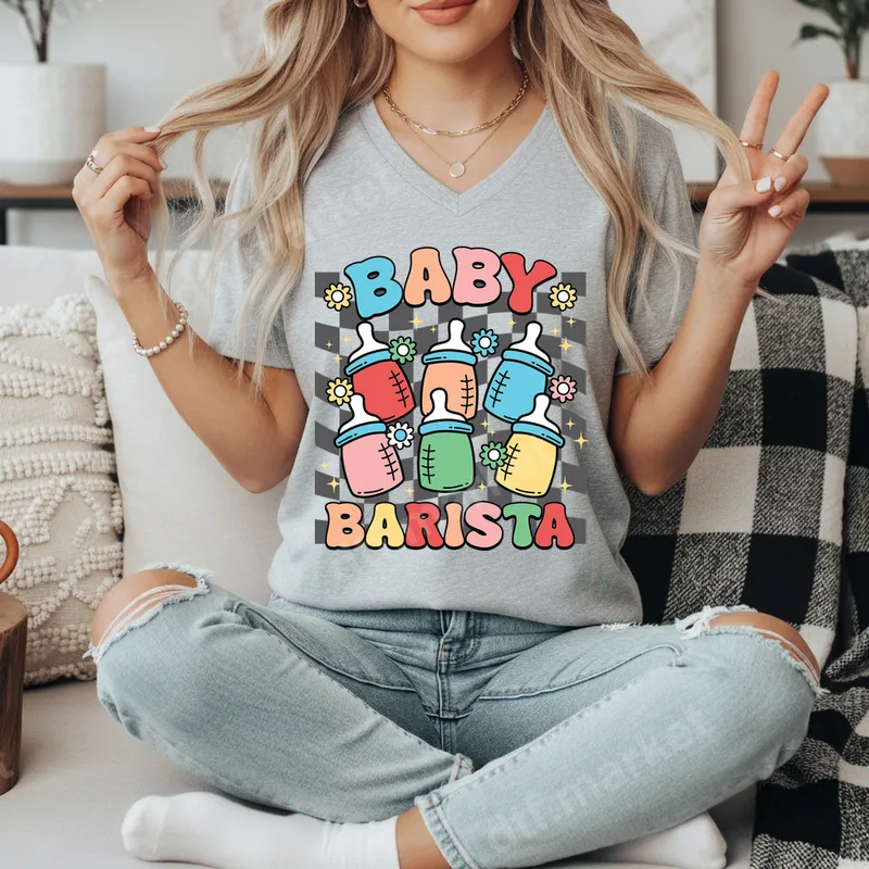 See allThis charming DTF transfer features a playful "Baby Barista" design, perfect for any parent who runs on coffee and baby cuddles. The retro-inspired bubble letters are paired with an array of colorful baby bottles, set against a stylish checkerboard background with cute little flowers and sparkles. This eye-catching design is ready to press, making it simple to create personalized apparel. Ideal for new moms, expecting parents, and even proud grandparents, this iron on transfer makes a fantastic statement piece. It’s perfect for baby showers, pregnancy announcements, or as a thoughtful gift for a new arrival. Celebrate the beautiful chaos of parenting with this funny and adorable heat press design, suitable for anyone who enjoys a blend of humor and heartfelt sentiment. Applying this high-quality heat press transfer is a breeze! It works beautifully on a variety of fabric types, including cotton, polyester, and their blends. Simply use a heat press at 300-325°F for 15 seconds with medium pressure, or apply with a household iron for smaller projects. There’s no complex weeding or layering required, so your custom apparel project will be finished in minutes. Crafted using professional-grade direct to film transfer technology, this design ensures vibrant colors and exceptional durability. The print is crack-resistant, soft to the touch, and will withstand numerous washes, keeping your apparel looking fresh. You’re getting a premium t-shirt transfer with strong adhesive, guaranteeing a long-lasting and professional finish every time.