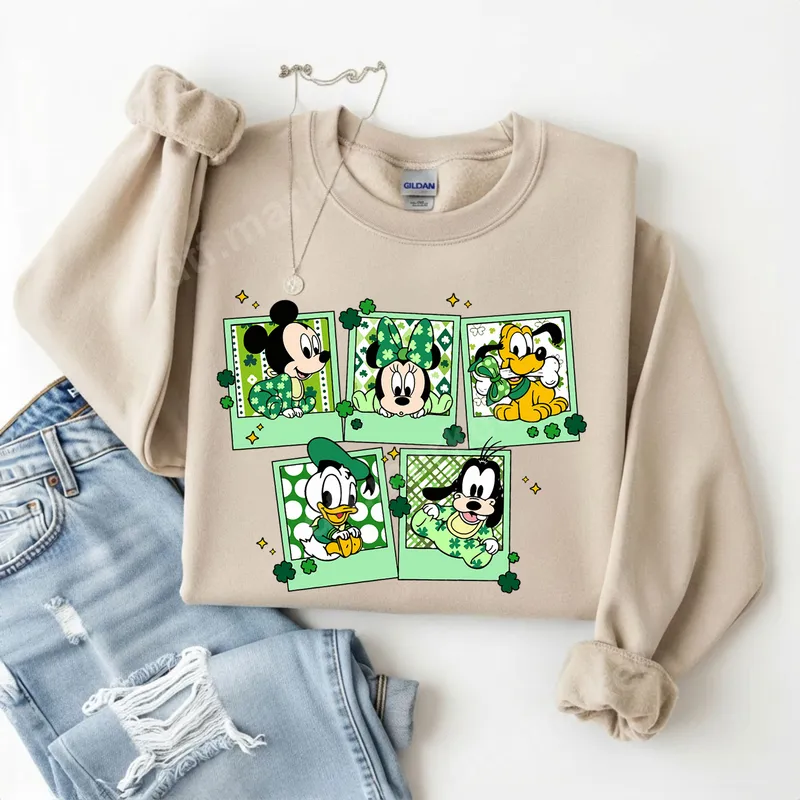 See allThis vibrant DTF transfer features beloved Baby Disney characters – Mickey, Minnie, Pluto, Donald, and Goofy – all dressed in festive green attire and surrounded by lucky shamrocks. Each character is playfully captured within a Polaroid-style frame, creating a charming and nostalgic look. This ready to press design is perfect for celebrating St. Patrick's Day with a touch of classic Disney magic and whimsy, bringing a cheerful spirit to any garment. This delightful heat press transfer is ideal for Disney fans of all ages, families, and anyone looking to create unique St. Patrick's Day apparel. It makes a fantastic gift for friends or loved ones, perfect for parade wear, themed parties, or simply adding a festive touch to everyday outfits. Great for crafters and small business owners looking to offer popular holiday designs. Applying this high-quality iron on transfer is simple and efficient. It works seamlessly on a wide range of fabrics, including cotton, polyester, and various blends. For best results, use a heat press at 300-325°F for 15 seconds with medium, even pressure. This durable t-shirt transfer can also be applied with a household iron, offering versatility. No weeding or complicated steps are required, making customization a breeze. Our professional-grade direct to film transfers boast incredibly vibrant colors and exceptional detail, ensuring your finished product stands out. Designed for durability, this transfer is crack-resistant and maintains its soft feel even after multiple washes. The premium DTF film provides strong adhesion, resulting in a long-lasting, high-quality garment that feels great and looks professionally made.