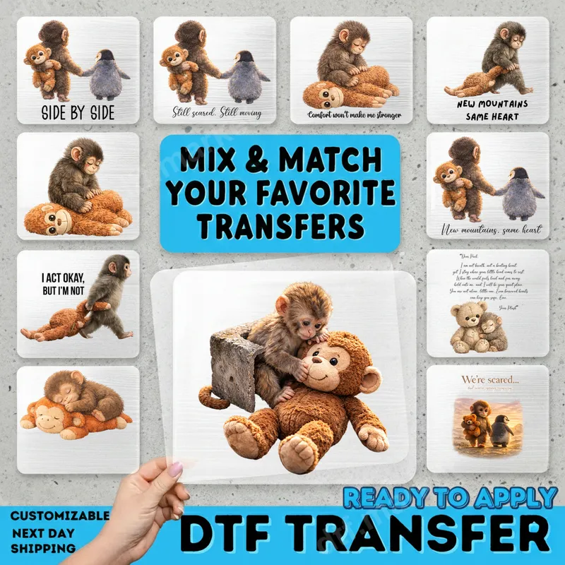 See allDiscover a collection of heartwarming designs with our baby monkey and friends DTF transfers. Each direct to film transfer features endearing illustrations of baby monkeys, cuddly teddy bears, and sweet penguins, paired with thoughtful, inspirational, and comforting quotes like "Still scared. Still moving" or "New mountains, same heart." These ready to press DTF transfers are perfect for adding a touch of gentle encouragement and emotional depth to any garment or accessory, making them ideal for personal wear or as meaningful gifts. These versatile heat press ready designs are perfect for anyone seeking to express empathy, offer a comforting sentiment, or carry a subtle reminder of inner strength. They make thoughtful gifts for friends, family, or anyone navigating challenges, serving as a gentle pick-me-up or a token of companionship. Ideal for birthdays, get-well-soon wishes, or simply to show you care, these apparel transfers allow you to create custom items that speak from the heart. Applying your new iron on transfer is simple and efficient. Our high-quality DTF transfers work beautifully on a wide range of materials, including cotton, polyester, and various fabric blends. For best results, use a heat press at 300-325°F for 15 seconds with medium pressure. These designs can also be applied with a household iron, offering flexibility for all crafters. Best of all, there's no weeding required, making your customization process quick and hassle-free. Crafted from premium DTF film with strong adhesive, our heat press designs boast vibrant colors, exceptional durability, and a soft-to-the-touch finish that resists cracking and peeling, even after multiple washes. Enjoy professional-grade results that look and feel fantastic on t-shirts, hoodies, tote bags, and more. These transfers are designed to last, ensuring your comforting messages remain bright and clear for years to come.
