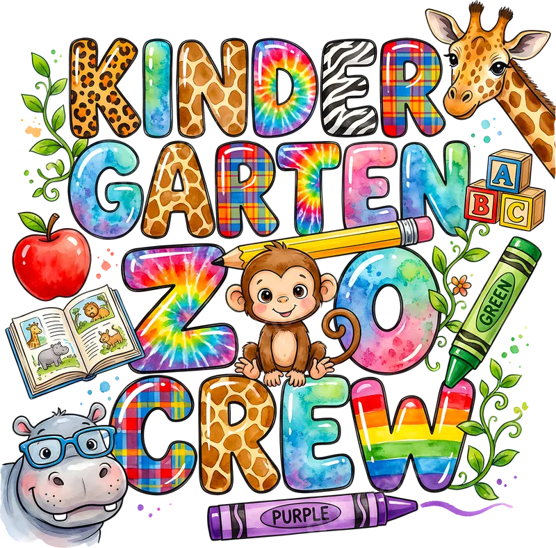 See allCelebrate the start of a new school year with this adorable Kindergarten Zoo Crew DTF transfer! This vibrant design features playful animals – a friendly giraffe, a cheeky monkey, and a cool hippo in glasses – alongside school supplies like ABC blocks, crayons, and an apple. The letters showcase a fun mix of animal prints, tie-dye, plaid, and rainbow watercolor textures, making this a truly eye-catching and ready to press design for any young student. This delightful design is perfect for parents, grandparents, and teachers looking to create unique back-to-school apparel. It makes a fantastic gift for incoming kindergarteners, a fun uniform for a 'zoo crew' class, or a charming addition to a teacher's wardrobe. Imagine the smiles on the first day of school with a personalized shirt featuring this cute cast of characters! Applying this high-quality heat transfer is simple. It works wonderfully on a variety of fabrics including cotton, polyester, and blends. For best results, use a heat press at 300-325°F for 15 seconds with medium pressure, then cold peel. For household iron users, ensure even, firm pressure across the entire iron on decal. No tedious weeding or layering is required, saving you time and effort. Our professional-grade DTF transfers deliver exceptional quality, ensuring your apparel transfer is vibrant, durable, and soft to the touch. The design resists cracking and fading, maintaining its brilliant colors wash after wash. Transform ordinary garments into personalized masterpieces with this charming, long-lasting direct to film transfer.