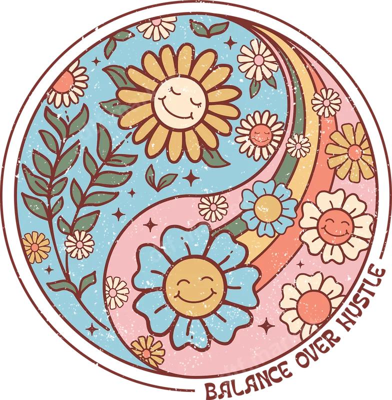 Balance Over Hustle Retro Floral DTF Transfer | Yin Yang Smiley Flowers