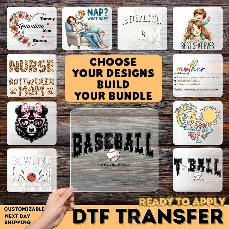 See allThis striking Baseball Mom DTF transfer features bold, collegiate-style "BASEBALL" lettering with a classic baseball graphic, perfectly complemented by elegant script "mom" underneath. It's the ultimate way for any proud mother to showcase her support for her favorite player. This high-quality, ready to press design is perfect for customizing apparel quickly and easily. This heat transfer is designed for the dedicated baseball mom, softball mom, or any proud parent cheering from the stands. It's ideal for game days, practices, team events, or as a thoughtful gift for Mother's Day, birthdays, or end-of-season celebrations. Create matching outfits for your family or a unique present for your favorite baseball enthusiast. Our premium iron on decal can be applied to a wide range of materials, including cotton, polyester, and various blends, making it versatile for any project. Simply use a heat press at 300-325°F for 15 seconds with medium pressure. Unlike traditional vinyl transfer methods, there's absolutely no weeding required, saving you time and effort. For best results, a household iron can also be used with careful application. Expect vibrant colors and a soft-to-touch finish with every application of this shirt design. Crafted with professional-grade DTF film and strong adhesive, our transfers are built to be crack-resistant and durable, ensuring they withstand countless washes and wear. Give your garments a professional, long-lasting look with our high-quality apparel transfer.