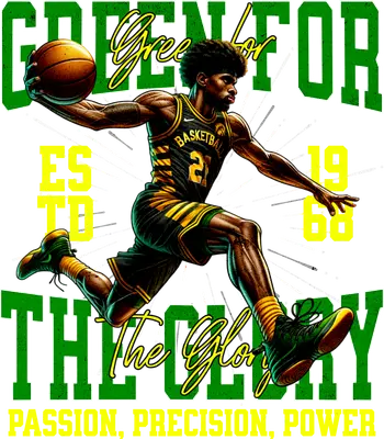 See allUnleash your passion for the game with this electrifying basketball player DTF transfer. Featuring a dynamic player mid-dunk, dressed in a striking green and gold uniform, surrounded by text that reads "GREEN FOR THE GLORY ESTD 1968" and "PASSION, PRECISION, POWER." This vibrant design captures the energy and spirit of basketball, making it a powerful statement piece. It’s a premium quality, ready to press design, perfect for personalizing any garment with professional results. This athletic heat transfer design is perfect for basketball players, dedicated fans, coaches, and sports enthusiasts. It makes an excellent gift for team members, booster clubs, or proud parents wanting to show support during basketball season, tournaments, or school sports events. Small apparel businesses and crafters will find this iron on transfer an easy way to create custom team merchandise or unique sports-themed clothing lines, appealing to those who appreciate a classic yet energetic athletic vibe. Applying this heat press transfer is simple and efficient. It adheres beautifully to a wide range of materials including cotton, polyester, cotton-poly blends, and even nylon, providing versatility for your projects. Achieve a flawless application using a heat press at 300-325°F for 15 seconds with medium pressure, or easily apply with a household iron. Forget tedious weeding; this custom t-shirt transfer is ready to peel and press. Ideal for custom t-shirts, hoodies, sweatshirts, tote bags, and athletic jerseys. For lasting durability, wash garments inside out and tumble dry on low. Experience superior quality with this ready to press transfer. It boasts vibrant, full-color printing with exceptional detail, ensuring every muscle and stripe pops. The finish is crack-resistant and soft to the touch, avoiding the heavy, stiff feel of traditional vinyl transfers. Each direct to film transfer is meticulously printed on premium DTF film, engineered with a strong adhesive backing for outstanding adhesion and a professional, long-lasting finish that truly embodies the spirit of the game.
